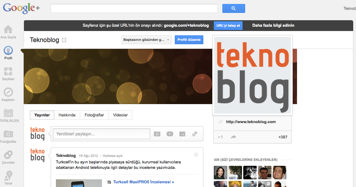 Teknoblog’un Google+ üzerinde bulunan sayfasında da benzer bir bildirimle karşılaştık. Sağolsun Google bizim için “teknoblog” uzantısını önceden ayırmış, biz de oldukça kısa süren bir kayıt işleminden sonra bu özel URL’yi kaydettirmeyi başardık. Artık Google+ sayfamıza http://google.com/+teknoblog adresinden daha kolay şekilde ulaşabileceksiniz.