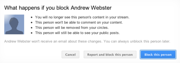 Google+’ya eklenen son yeniliklerle birlikte uygunsuz yorumları şikayet etmek mümkün. Bunu yaptığınızda karşınıza çeşitli seçenekler çıkacak, size yoruma şikayet etme fikrinden geri dönme, yorumu tamamen silme ya da hem yorumu silip hem de gönderimde bulunan kişiyi engelleme gibi seçenekler sunulacak. En sonuncusunu yapmak o hesabı gelecekte sizin paylaşımlarınıza yorum yapmaktan alıkoymanın yanı sıra çevrelerinizden ve içerik akışlarınızdan da silecek.