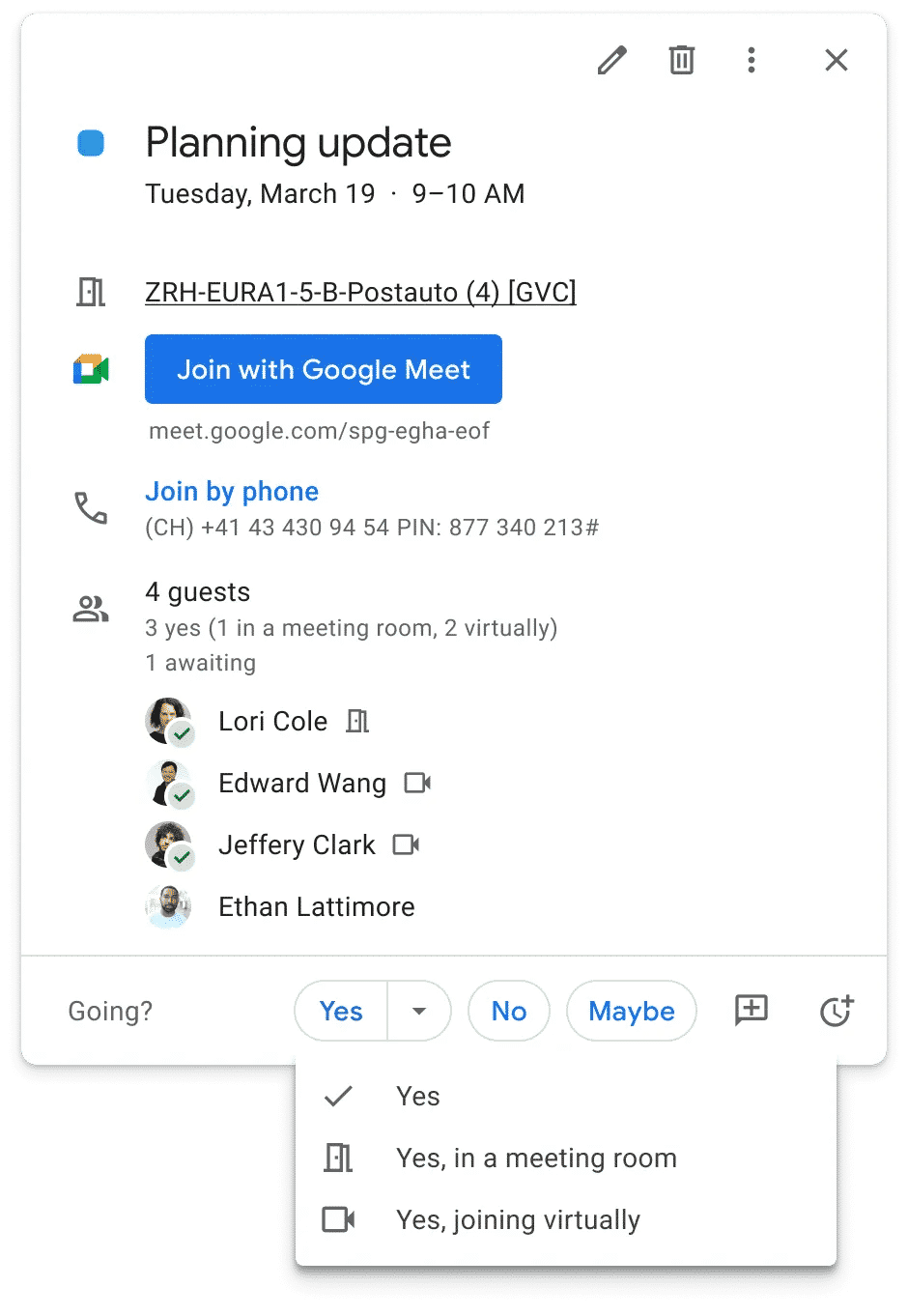 Sanal katılımcılar, etkinlik ayrıntılarında ev sahibi ve diğer konuklar tarafından görüntülenebilen yeni bir açılır menü aracılığıyla durumlarını belirtebilecekler. Şirket, insanların bir etkinliğe nasıl katılmayı planladıklarını belirtmenin, organizatörlerin ne bekleyeceklerini bilmelerine yardımcı olacağını ve muhtemelen fiziksel olarak odada olmayacak katılımcıları önceden bilmelerine izin vereceğini düşünüyor. Yeni seçenekler şu anda Takvim’deki davetlerle sınırlı olsa da, Google bunları gelecekte Gmail’de görünen davetlere de getirmeyi planlıyor.