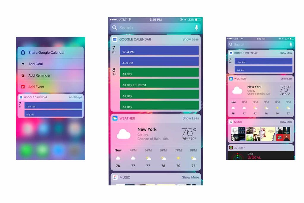 Görsel bileşen takvime işlenmiş yaklaşan iki etkinliği gösteriyor ve genişletilerek gösterim sayısı dörde uzatılabiliyor. Diğer Bugün görsel bileşenleri gibi, iPhone 6S ve iPhone 7 cihazlarında Google Takvim ikonuna 3D Touch’ı kullanıp hafifçe bastırarak aynı görünüme erişmek de mümkün oluyor.
