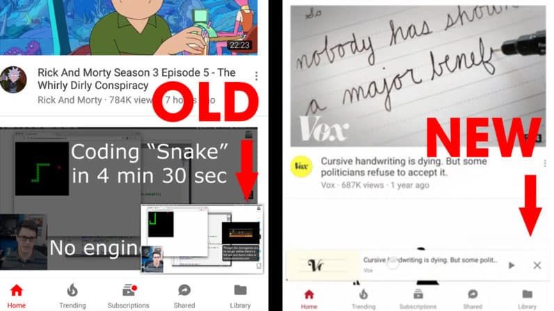 Yeni tasarım, kullanıcılara oynatılan video üzerinde biraz daha fazla kontrol imkanı sağlayarak bu özelliği geliştiriyor. Artık videolar ekranın altında oynatılmaya devam edecek şekilde küçültüldüğünde küçük resmin yanında oynatma butonları yer alacak. Yeni tasarımda videoyu kapatmakta kullanılan standart “X” butonunun yanı sıra “Başlat/Durdur” butonu bulunacak.