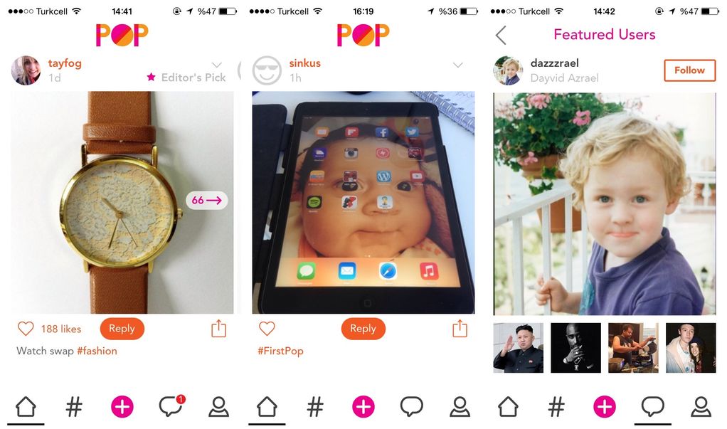 Uygulama içinde dolaşımsa ekranın alt kısmında bulunan araç çubuğuyla gerçekleştiriliyor. Ana ekrana yönlendiren ev ikonu çubuğun en solunda yer alırken, hemen sağında bulunan “#” ikonuna dokunulduğu zaman uygulamanın keşif bölümüne yönlendiriliyor. Burada uygulama içinde sıklıkla kullanılan etiketler alt alta sıralanırken, GoPop’un tavsiye ettiği kullanıcılara ve diğer kullanıcılar tarafından beğenilen pop’lara bu sekme aracılığıyla erişilebiliyor. Kısacası bu bölümü Twitter’ın Trending Topic listesine benzetmek yanlış olmayacaktır.