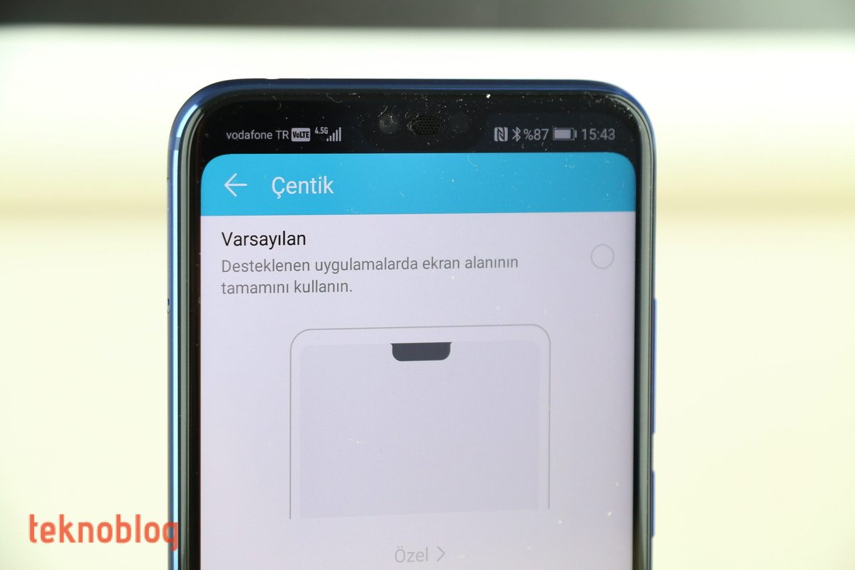 Ön yüze tekrar geri gelecek olursak, tıpkı P20 Pro modelinde olduğu gibi, Honor 10’da da ekranın üst kısmında bir çentik bulunuyor. Kamera, sensör ve ahize hoparlörü küçük bir alana sığdırıldığı için ekrandaki çentik de iPhone X’dakine göre daha küçük kalmış. Sonuçta üst kısımda, bildirim çubuğu için daha fazla alan kalıyor. Eğer çentik görüntüsü hoşunuza gitmiyorsa, Ayarlar içinden bu tarz görünümü kapatabilirsiniz. Bu durumda çentiğin etrafı siyah renkle kaplanıyor, klasik bir ekran görünümüne yakın bir görüntü elde ediliyor.