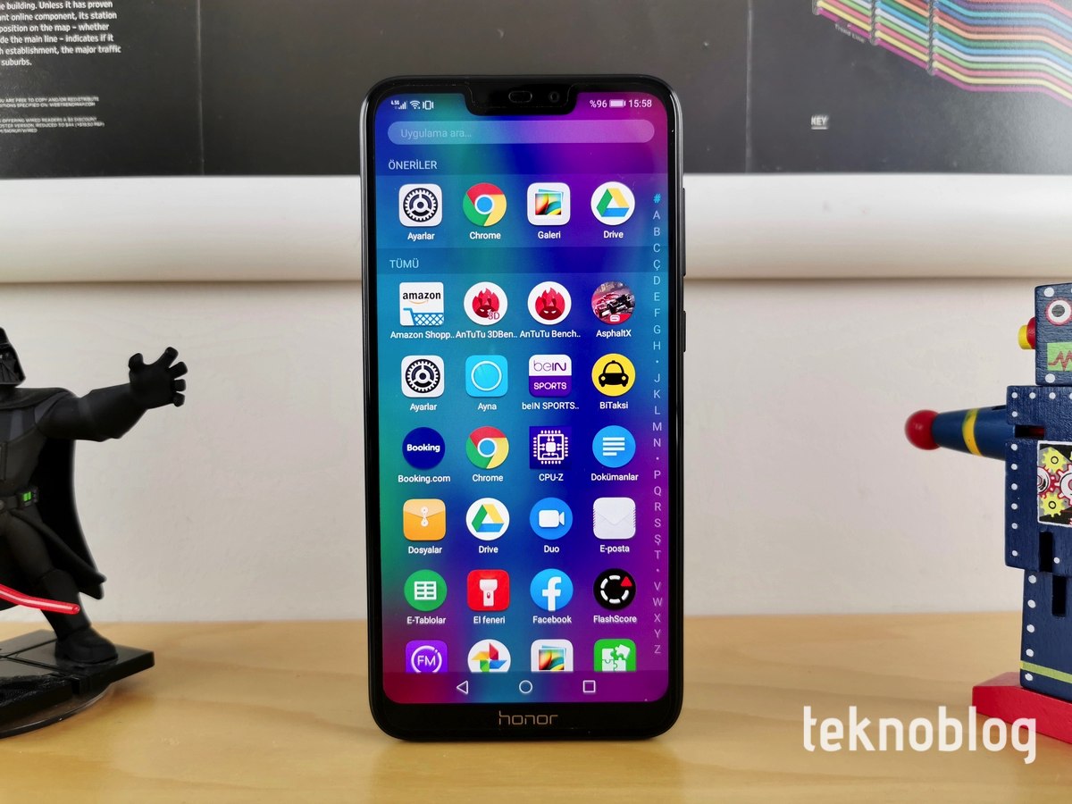 Honor 8C’nin ön yüklü uygulama katalogu, sadece Google’ın Android uygulamalarıyla sınırlı kalmıyor. Facebook, Booking.com, Amazon gibi uygulamalar da Honor 8C’de kullanıcıları karşılıyor. Akıllı telefonun Araçlar klasöründe ise kullanıcıların işine yarayabilecek çeşitli uygulamalar yer alıyor. FM Radyo, Yedekleme ve Phone Clone uygulamaları, bu klasörün öne çıkan parçaları oluyor. El feneri ve ayna gibi gün içinde ihtiyaç duyulabilecek araçların adresi de bu klasör.