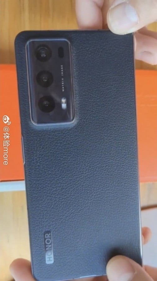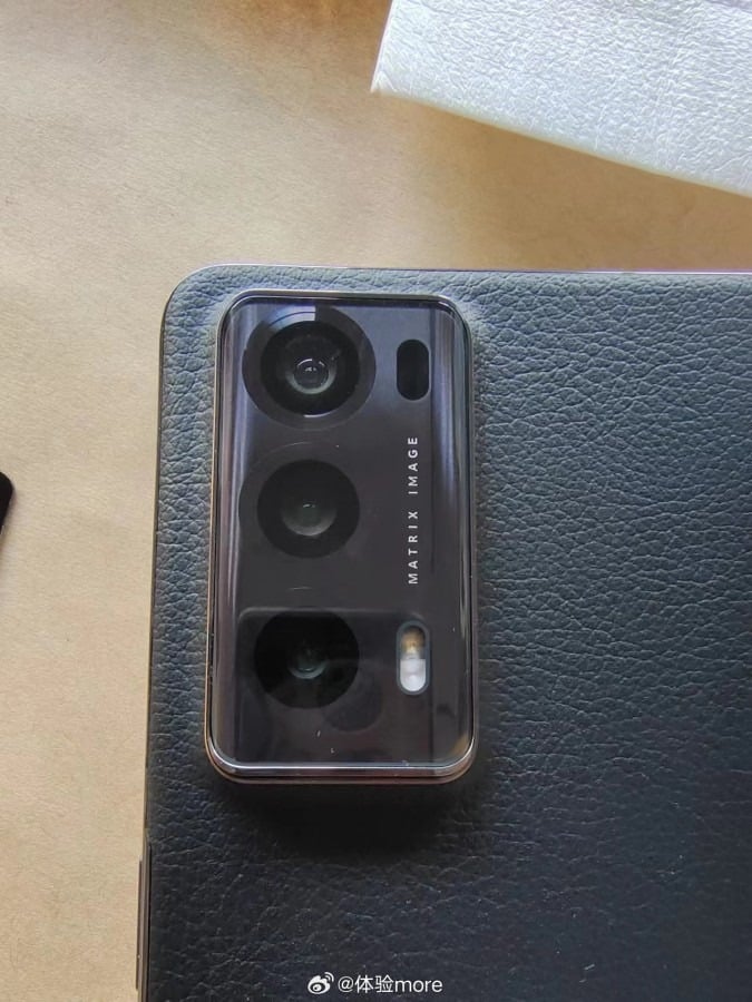 Hem siyah hem de mavi renk seçeneğinde arka panel deriyle kaplanmış gibi görünüyor. Kamera modülünün özellikle profilden çekilen fotoğraflarda bir hayli çıkıntı yapması dikkat çekiyor. Burada üç kamera sensörü yer alıyor. Ana kamera görevini diyafram genişliği f/1.9 olan 25 mm lensin üstleneceği şimdiden bilinenler arasında yer alıyor.