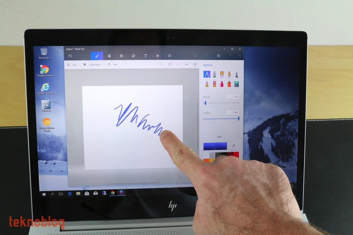 Bu arada ekranın dokunma desteğine sahip olduğunu bilmek bazı kullanıcıların hoşuna gidecektir. Doğrusunu söylemek gerekirse, bir dizüstü bilgisayarda dokunmatik ekran fazla kullanışlı değil. Ancak EliteBook 1040 G4’ün ekranı 180 derecelik menteşe yapısı sayesinde yüzeye kadar yaslanabiliyor. Böylelikle yüzeyden destek alarak parmakla veya kalemle çizim yapılabilr veya el yazısıyla yazı yazılabilir. Bunun yanı sıra Windows 10 kullanıcı arayüzünde gezinti yapmak için parmaklarınızı kullanabilir, pratiklik olsun diye çeşitli dokunmatik hareketleri kullanabilirsiniz.