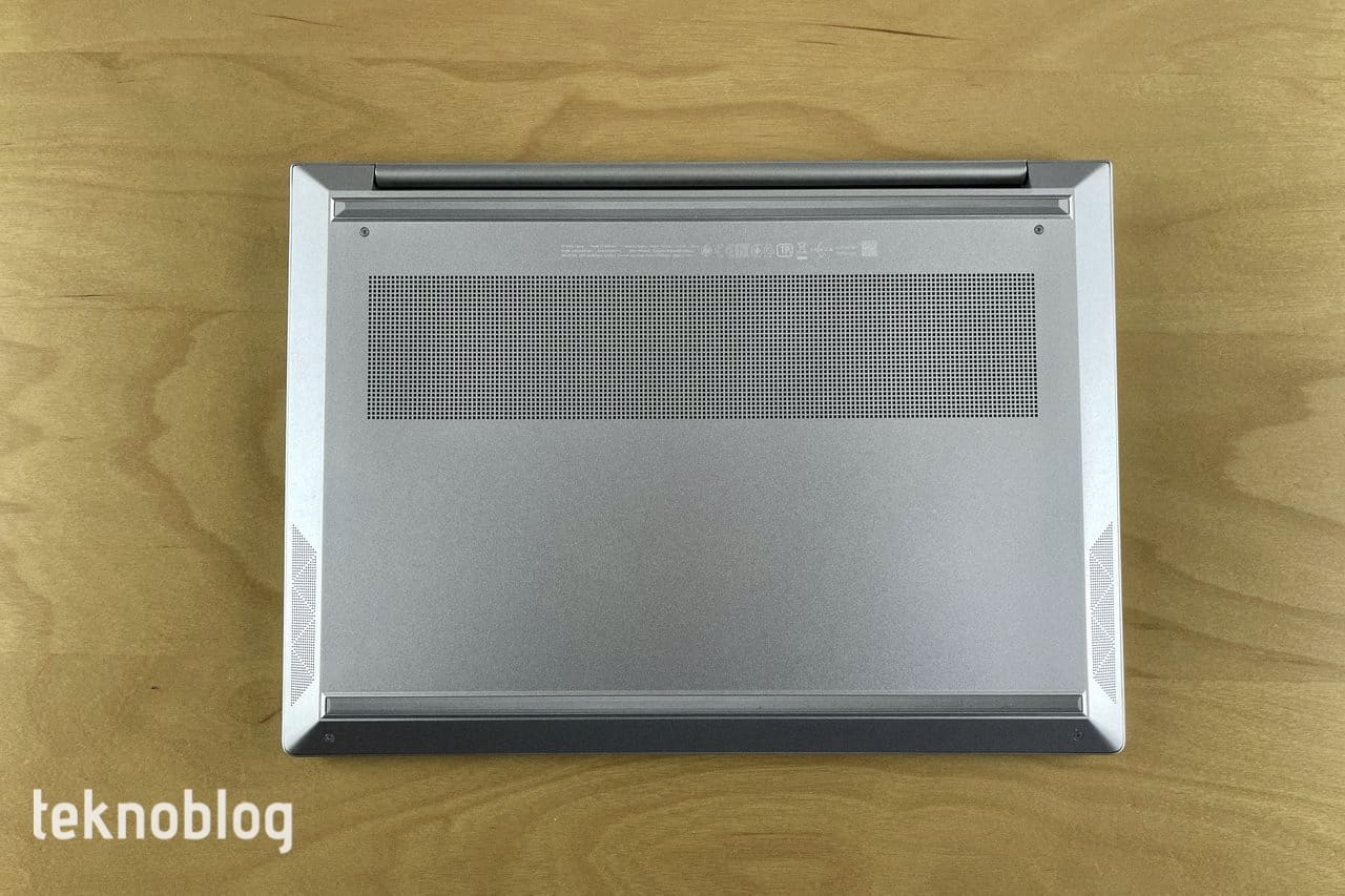 Taban bölümüne geçtiğimizde öncelikle bilgisayarın alt kısmına göz atalım. Burada bir kenardan diğerine uzanan iki tane ince ve uzun lastik tampon var. Bunlar sayesinde dizüstü bilgisayarın metal alt kısmı yüzeyle temas etmiyor, çizilme gibi bir durum söz konusu olmayacaktır. Buna ek olarak yüzeyden hafif de olsa yükseltilmesi, içerideki havanın dışarı atılmasına yardımcı olacaktır. Alt tarafta büyük bir havalandırma ızgarası bulunuyor. Bu da soğutma sisteminin verimli biçimde çalışmasına yardımcı oluyor. Bu arada bilgisayarın uzun kenarında da, bir taraftan diğer tarafa uzanan havalandırma ızgarasını görüyoruz.