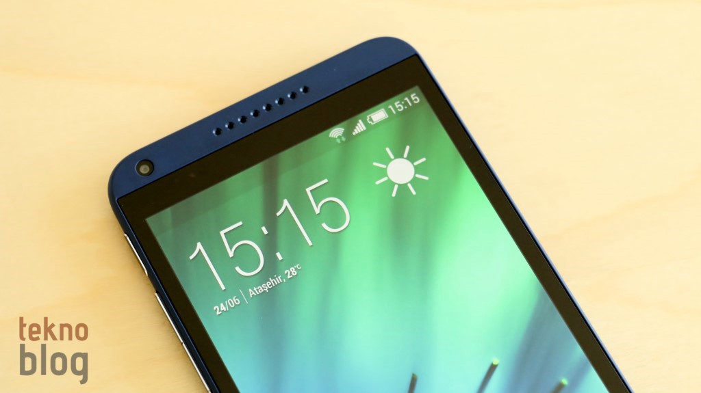 HTC Desire 816’nın 5.5 inç ekranının üstünde ve altında BoomSound stereo hoparlörler bulunuyor. One serisi cihazların aksine, Desire 816’da birkaç büyük delikli hoparlör ızgaralarını görüyoruz. Ekranın altında HTC logosunu barındıran bir alan var. One (M8)’de olduğu gibi Desire 816’da da Android’de gezinme işlemleri ekranın alt kısmındaki sanal navigasyon tuşlarıyla sağlanıyor. Ekranın üstünde LED bildirim lambası, sensörler ve 5 megapiksel ön kamera bulunuyor.