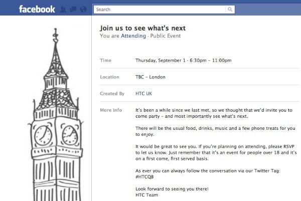 Takvimlerinize 1 Eylül tarihini not düşün, çünkü o gün HTC Londra’da bir etkinlik düzenleyecek. HTC UK’nin Facebook sayfası üzerinden duyurulan ve Pocket-Lint sitesinin dikkatini çeken bu etkinlik duyurusu Facebook sayfasının hayranlarını partiye ve sıradaki ürünleri görmeye çağırıyor. Aslında benzer bir etkinlik üç hafta önce HTC Türkiye tarafından düzenlenmiş, HTC Türkiye Facebook sayfası hayranlarının katıldığı bir partiyle HTC Salsa ve ChaCha Facebook telefonlarının Türkiye lansmanı yapılmıştı.