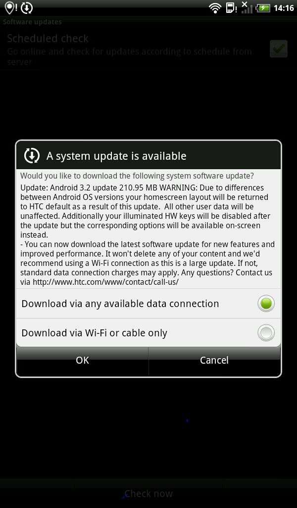 Teknoblog Test Merkezinde bulunan HTC Flyer tablet üzerinde yaptığımız güncelleme denetiminde de yeni sürümün varlığını gördük. Bu durumda Türkiye’de satılan Wi-Fi+3G Flyer’lar için de güncellemenin çıktığı varsayımında bulunabiliriz. Bu noktada diğer HTC Flyer sahiplerinin de yorumlarını bekliyoruz. 3.55.405.1 numaralı bu güncelleme 210 MB’lık kurulum dosyasına sahip. Yani, indirmek için en iyisi bir Wi-Fi şebekesi kullanmak.