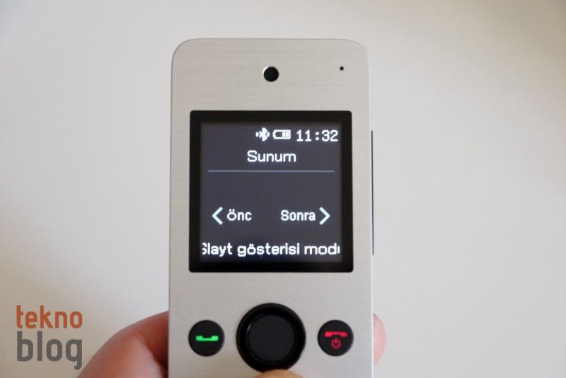 Son olarak Sunum özelliği de HTC Mini+’ın sunumlarda yardımcı aksesuar olarak kullanılmasını mümkün kılıyor. Navigasyon tuşlarını kullanarak sayfalar arasında gezinebilir, üstte bulunan kızılötesi işaretleyicinin de Enter tuşuna basılı tutarak sunumlar sırasında kullanılmasını sağlayabilirsiniz. HTC Mini+ kapalıyken de Enter tuşuna basılı tutarak lazer işaretleyicisini kullanabilirsiniz.