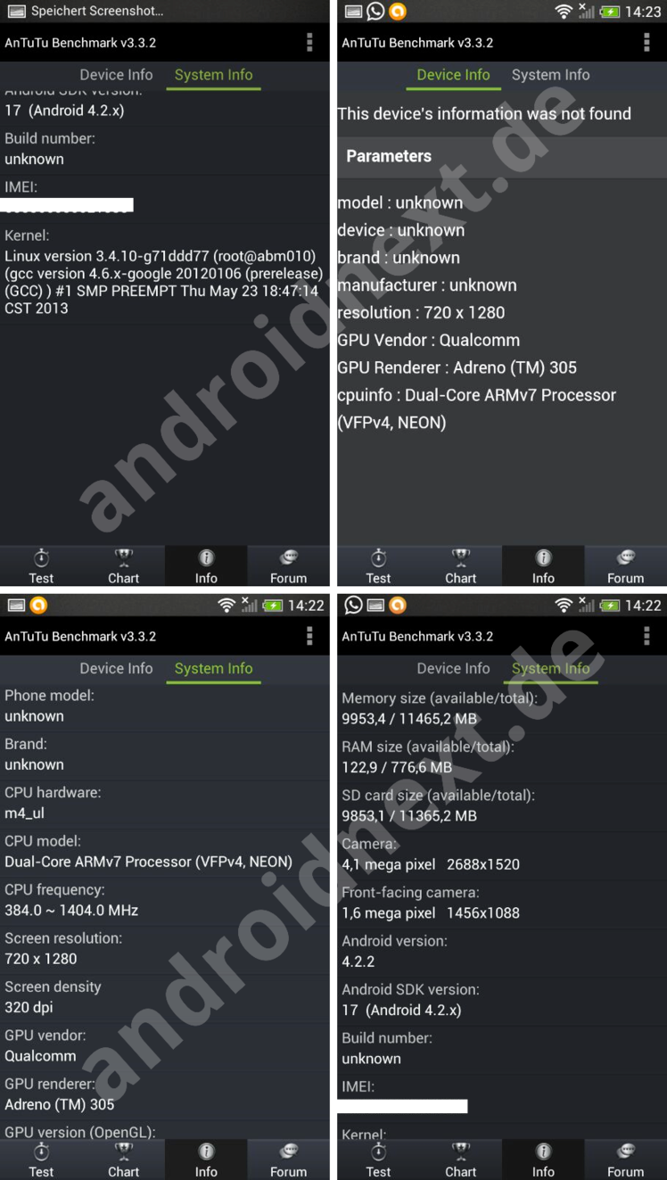 HTC One mini’nin ekranı 1280 x 720 çözünürlüğe sahip olacak gibi görünüyor. AnTuTu benchmark testinden alınan ekran görüntüsü de cihazın 320 ppi’lik piksel yoğunluğu değerini gösteriyor. Bu da HTC One mini’nin 4.3 inç gibi bir ekran büyüklüğüne sahip olacağını işaret ediyor.