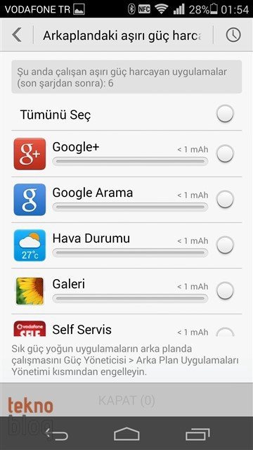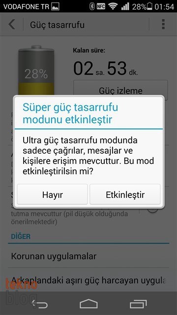 Bu arada Huawei Ascend P7’de yer alan süper güç tasarruf modu pil seviyesi azaldığında devreye giriyor, ana ekran güç kullanımı minimuma inecek şekilde monokrom tasarıma bürünüyor, hücresel bağlantı da kapatılıyor. Telefon sadece SMS ve görüşmeler için kullanılıyor.