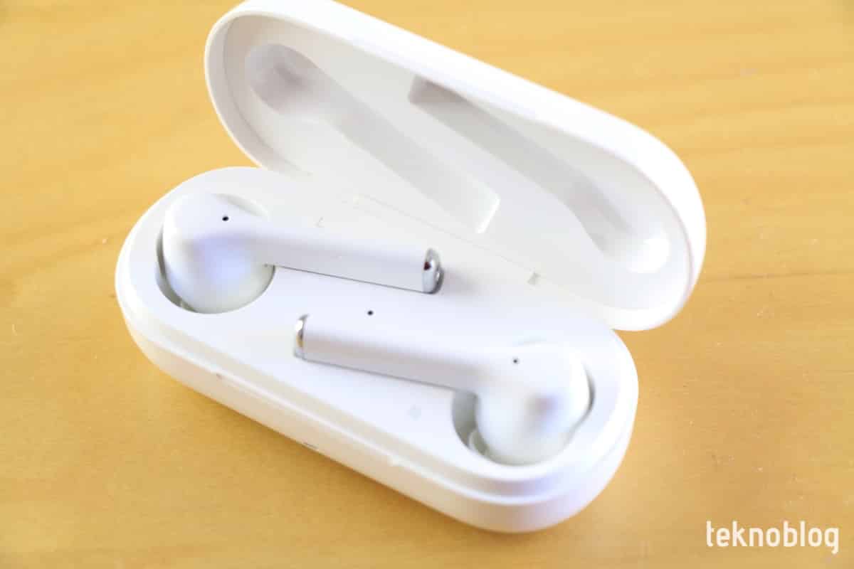 Kapağı kaldırdığınızda FreeBuds 3i kulaklıkların yatay biçimde yerleştirildiğini göreceksiniz. L ve R harfleriyle hangi tekin hangi kulağa uyduğu gösteriliyor. Bu iki kulaklık yuvasının ortasında ise kulaklıkların şarj durumunu gösteren ikinci bir LED gösterge bulunuyor. Kulaklık yuvalarının içinde şarj için eklenmiş ikişer bağlantı noktası var. Kulaklıklar yuvalarına manyetik kuvvet yardımıyla sıkıca tutunuyor. Buna rağmen her bir teki kolaylıkla alıp kulaklarınıza hızlıca yerleştirebilirsiniz.