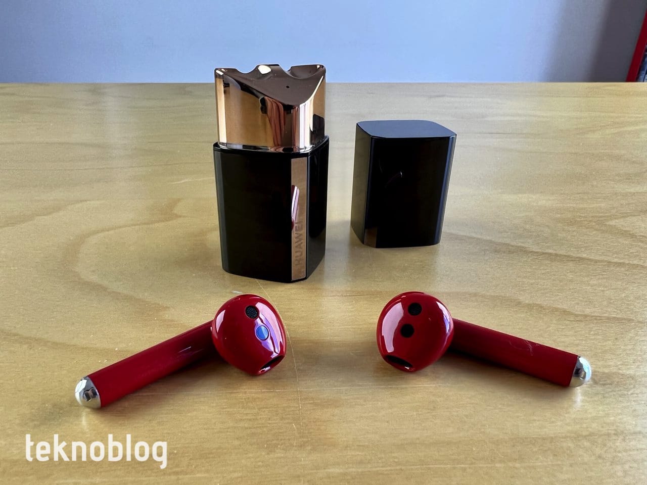 Tabii ki, şimdiye kadar sözünü etmediğimiz en önemli hususa, ruj biçimindeki şarj kutusuna gelelim. Huawei, bu kutuyu gerçek bir ruja çok iyi şekilde benzetmiş. Bunu gören bir kişi, bunun bir kulaklık yerine pahalı markalı bir ruj olduğunu düşünecektir. Paslanmaz çelik gövde ve üzerindeki Huawei logosu ve onun üstüne işlendiği metal şerit çok çekici görünüyor. Bununla birlikte parmak izini biraz fazla gösterdiğini söylememiz gerekiyor. Kutunun kapağı kolaylıkla açılıyor, mıknatıslar yardımıyla da kapandığında sıkıca yerine oturuyor. Alt kenarda USB-C portu var. Kutunun kapağını kaldırdığınızda, kırmızı renkli kulaklıklar, kırmızı renkli bir ruj gibi görünüyor. Uzaktan gören bir kişi, bunu kesinlikle bir kulaklık değil, ruj zannedecektir. Her bir FreeBuds teki yuvasından kolaylıkla çıkıyor, aynı şekilde yerine yerleştiriliyor. İki yuvanın ortasındaki lamba şarj durumunu görmeyi sağlıyor. Şarj kutusunda ise benzer bir lamba görmüyoruz.