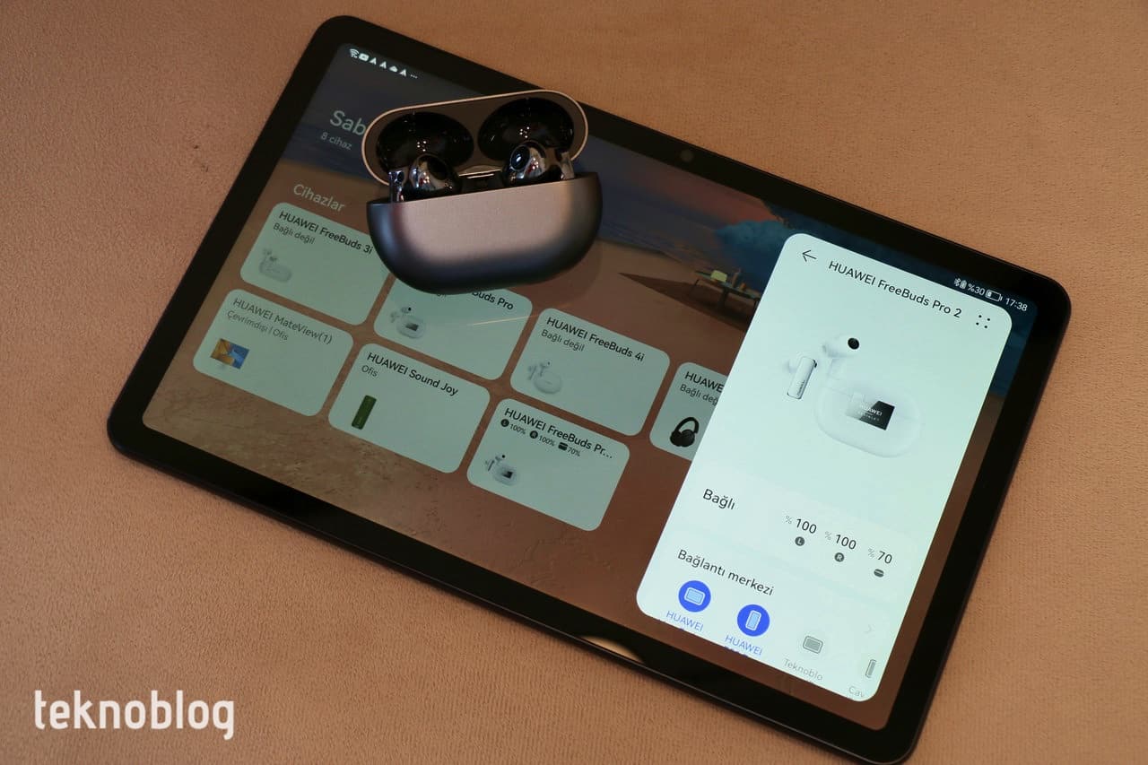 Bluetooth 5.2 desteği sayesinde Huawei FreeBuds Pro 2, eşleştirildiği cihazla her seferinde hızlı şekilde bağlantı kurmayı sağlıyor. Menzili de iyi, kaynak cihazla arada 10 metre mesafeye kadar, araya duvarlar girse bile kesintisiz bağlantı sağlanıyor. 5.2’nin getirdiği avantajlardan bir tanesi aynı anda iki cihazla bağlantı kurabilmesi. Böylelikle bilgisayarınızı, tabletinizi veya akıllı telefonunuzu aynı anda bağlı tutabilirsiniz. Örneğin, P50 Pro ve MatePad 10.4’ü FreeBuds Pro 2’ye aynı anda bağladık; tablette bir şeyler izlerken P50 Pro üzerindeki AI Life uygulamasından kulaklığın ses ve gürültü engelleme kontrollerini yapabiliyor, pil durumunu görebiliyoruz.