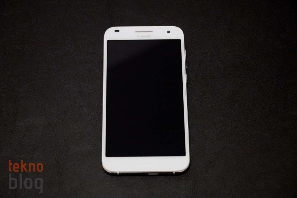 Huawei G7’nin beyaz renkli versiyonu, ön yüzündeki dokulu yüzeyi daha iyi yansıtıyor. Kare desenli dokulu yapı ışığa tutulduğunda daha iyi şekilde fark ediliyor. Telefonun ön yüzünde herhangi bir fiziksel tuş yok. Navigasyon işlevleri işletim sistemine entegre edilen yazılımsal tuşlar yardımıyla sağlanıyor. Yine de Huawei, G7’nin ekranının üst ve alt kenarlarını aynı genişlikte tutmayı tercih etmiş. Bunun telefonun içindeki çeşitli bileşenlerin dizilimiyle bir ilgisi olmalı. Ekranın üst kısmında Huawei logosu, onun üstünde ahize hoparlörü yer alıyor. Sol üst köşede sensör ve LED durum gösterge lambası, sağ üst köşede de 5 megapiksel ön kamera bulunuyor.