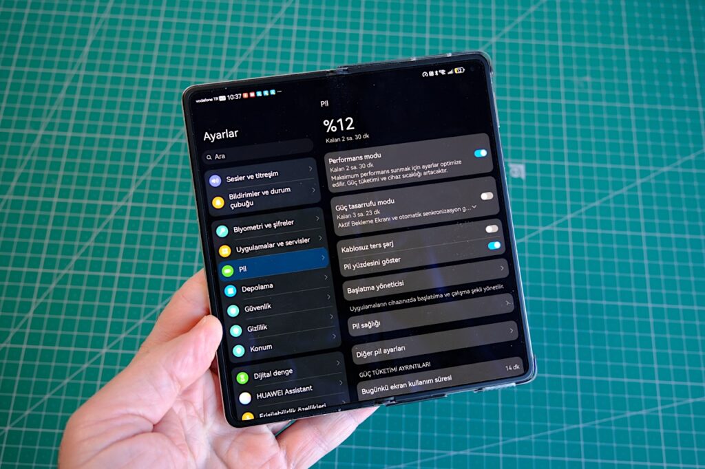 Günlük kullanım senaryolarında pil süresi beklentileri fazlasıyla karşılıyor. Sosyal medya kullanımı, e-posta kontrolü, video izleme ve arama gibi temel fonksiyonlar için Huawei Mate X6’nın şarjı oldukça uzun gidiyor. Eğer ekran parlaklığı fazla açılmaz ve yenileme hızı dinamik modda bırakılırsa, cihazın bataryası 1,5 güne kadar dayanabiliyor. Ağır kullanım senaryolarında ise gün içinde bir kez şarj ihtiyacı hissedilebiliyor ancak 66W hızlı şarj sayesinde bu süreç çok kısa sürüyor. Rakipleriyle kıyaslandığında, özellikle kablosuz şarj hızı ve ters şarj özellikleriyle fark yaratıyor. Pil ömrü açısından kullanıcı dostu bir cihaz olan Huawei Mate X6, uzun vadeli kullanım için ideal bir seçenek sunuyor.