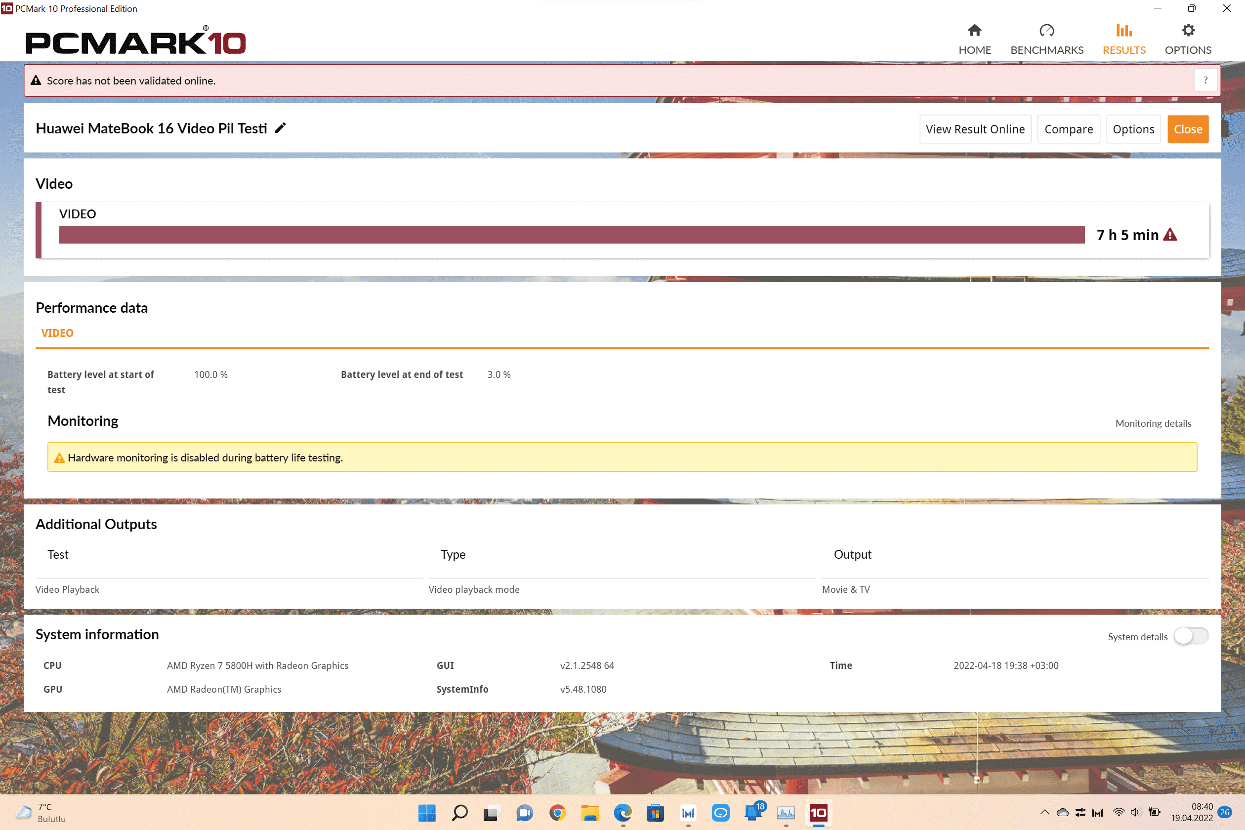 Pil tarafına geldiğimizde, MateBook 16’da 84Wh kapasiteli pil bulunuyor. Bu pil, Huawei’nin belirttiğine göre 12,5 saate kadar kesintisiz yerel video oynatma imkanı sağlıyor. Bizim PCMark 10 dahilinde gerçekleştirdiğimiz video pil testinde ise, yüzde 50 ekran parlaklığında 7 saatlik bir video oynatma süresi elde ettik. Tabii ki, ekran parlaklığını daha da kısarak Huawei’nin belirttiği süreye ulaşmak mümkün olacaktır. Deneyimlerimize dayanarak Huawei MateBook 16’nın, ekran parlaklığını maksimuma çıkarmadığınız takdirde sabahtan akşama bir iş günü içinde ihtiyaçlarınızı karşılayacağını söyleyebiliriz. Kullanmadığınız zamanlarda bilgisayarı uyku durumuna alarak pilden tasarruf edebilir ve bu şekilde tek bir şarjla bir günü çıkarabilirsiniz.