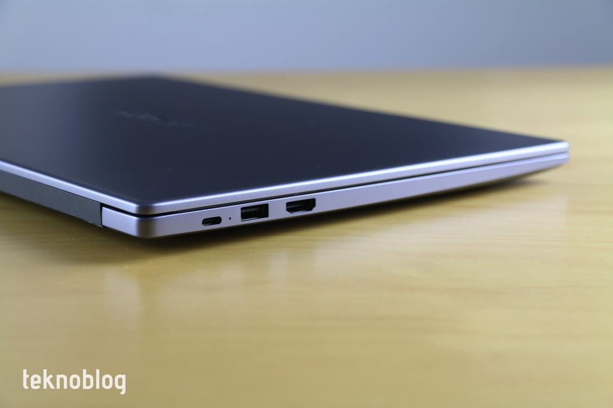 Portlar bakımından Huawei’nin dizüstü bilgisayarı ihtiyaçları karşılayacaktır. Toplam üç adet USB-A portu var. Bunlardan sağ kenarda yer alan iki tanesi USB 2.0 desteğine sahipken, sol kenarda bulunan teki de USB 3.0 desteği barındırıyor. Ayrıca bir adet USB-C portu var. Bunu hem USB-C aygıtlarını bağlamak için hem de şarj için kullanıyorsunuz. Huawei’nin özel bir güç bağlantı birimi kullanmaması güzel. Ayrıca sol tarafta bir adet HDMI portu da bulunuyor. Böylelikle harici ekranlara veya TV’ye bağlantıyı daha rahat şekilde yapabilirsiniz.