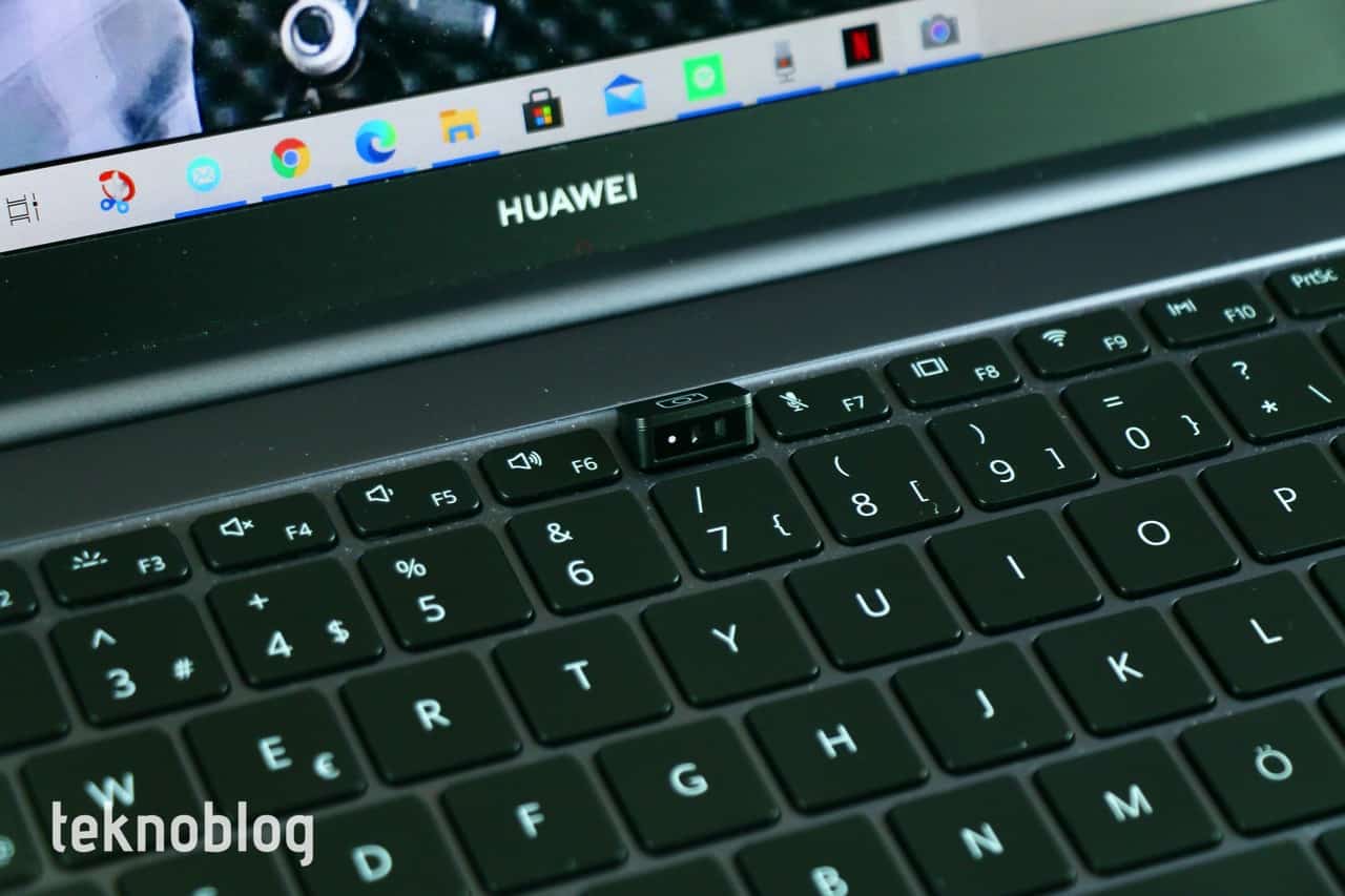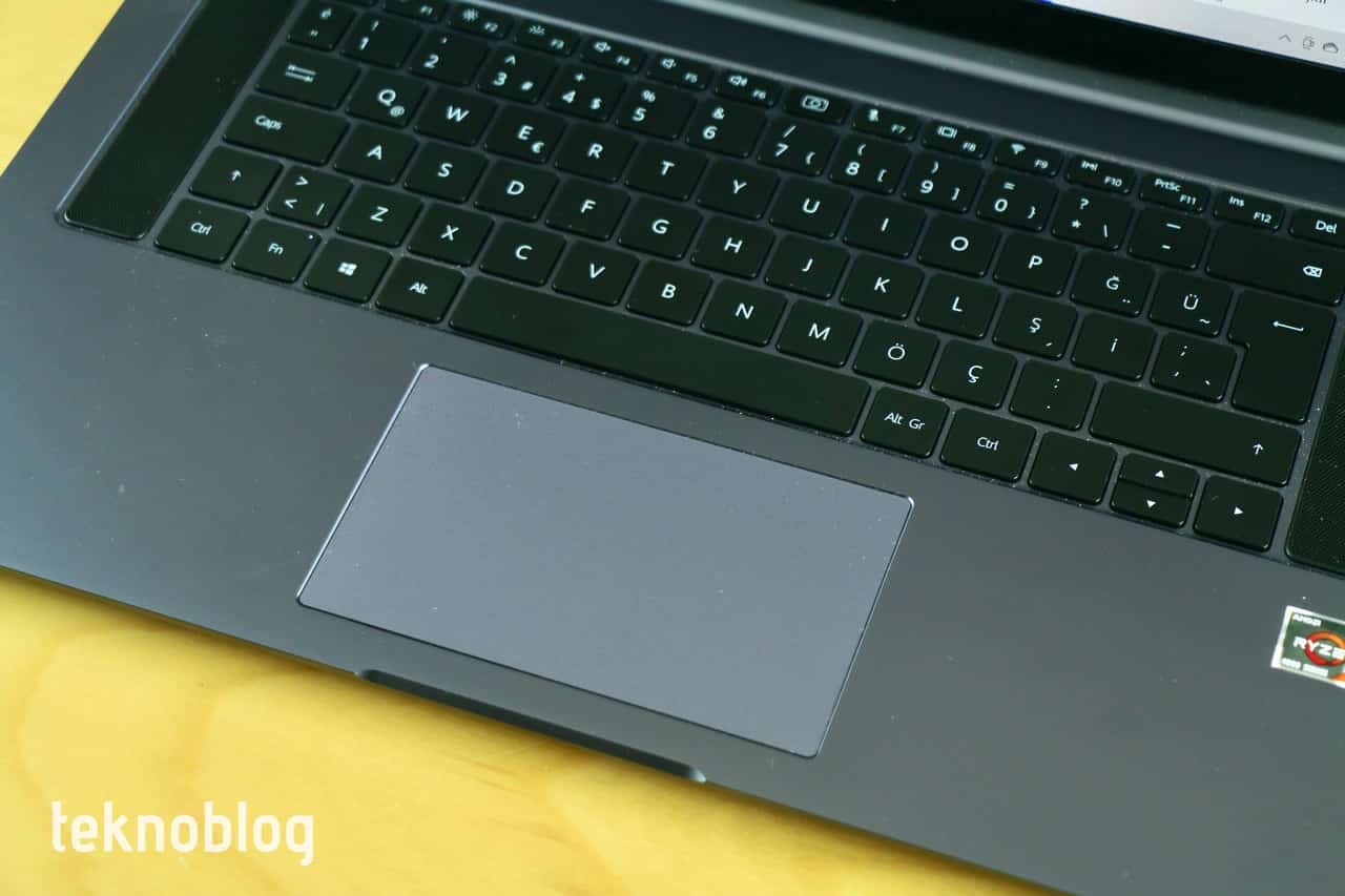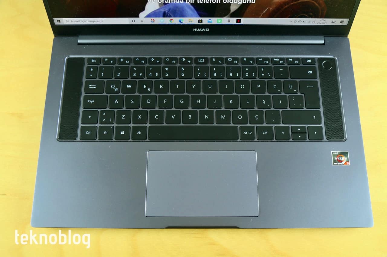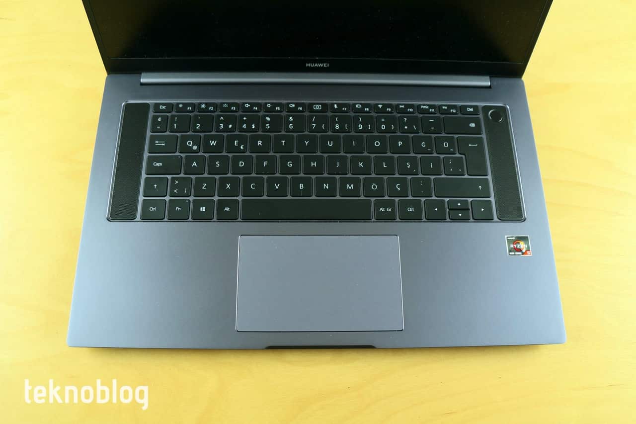 Klavyenin üst satırı ekran parlaklığı, ses ve bunun gibi kontroller için eklenen fonksiyon tuşlarına ayrılmış. Klavye arka aydınlatmalı, ancak klavye arka aydınlatma seviyesi çok yüksek değil. Parlaklık ayarı da birkaç kademeden ibaret. Eğer çok karanlıktaysanız ve bir şeyler yazmanız gerekiyorsa, klavye parlaklık ayarı işinize yarayacaktır. Klavyenin iki yanına birer hoparlör yerleştirilmiş. Sağdaki hoparlörün üst kısmında ise parmak izi okuyucusunun yerleştirildiği bir güç düğmesi bulunuyor. Parmak izi okuyucusu daha önce deneyimlediğimiz diğer Huawei dizüstü bilgisayarlarında olduğu gibi gayet hızlı çalışıyor. Ekran kilidini fazla beklemeden, kolayca açmak mümkün oluyor.