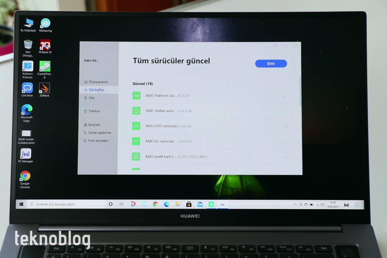 Huawei MateBook D16’da Windows 10 Home yüklü olarak geliyor. Huawei, ek olarak fazla bir yazılım ve aracı yüklü olarak sunmuyor. Geçen yılın modellerinde olduğu gibi PC Manager yazılımını yine görmeye devam ediyoruz. PC Manager, önceki sürümüne göre daha göz alıcı ve kullanıcı bir tasarıma kavuşmuş. Dizüstü bilgisayarın sürücü güncellemelerini yapabilir veya donanım durumlarını kontrol edebilirsiniz.