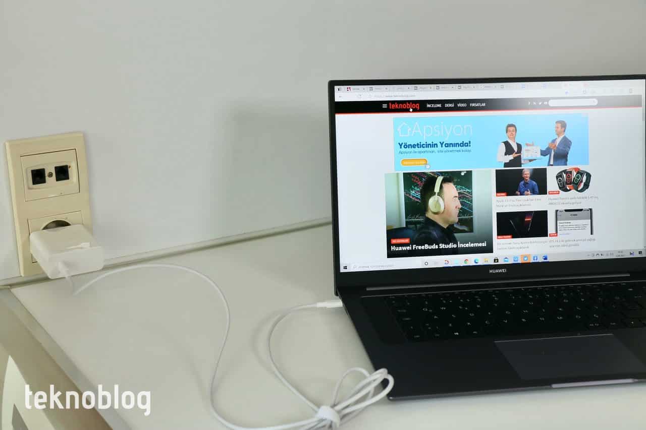 Pil süresi bakımından iyi bir performans ortaya koyan MateBook D16’nın şarj adaptörü diğer Huawei dizüstü bilgisayarlarında gördüğümüz gibi 65W’lık Huawei SuperCharge adaptörü. Bu güç adaptörü, standart bir dizüstü bilgisayarınkine göre çok daha küçük boyutlarda, ayrıca tek bir kabloyla birlikte geliyor. Üstelik elinizdeki USB-C uçlu akıllı telefonu veya tableti de bu güç adaptörüyle şarj etmeniz mümkün. Eğer Huawei Mate 40 Pro veya P40 Pro gibi bir akıllı telefon kullanıyorsanız, bu telefonlardaki hızlı şarj desteğinden de en iyi şekilde yararlanma imkanı elde edeceksiniz.