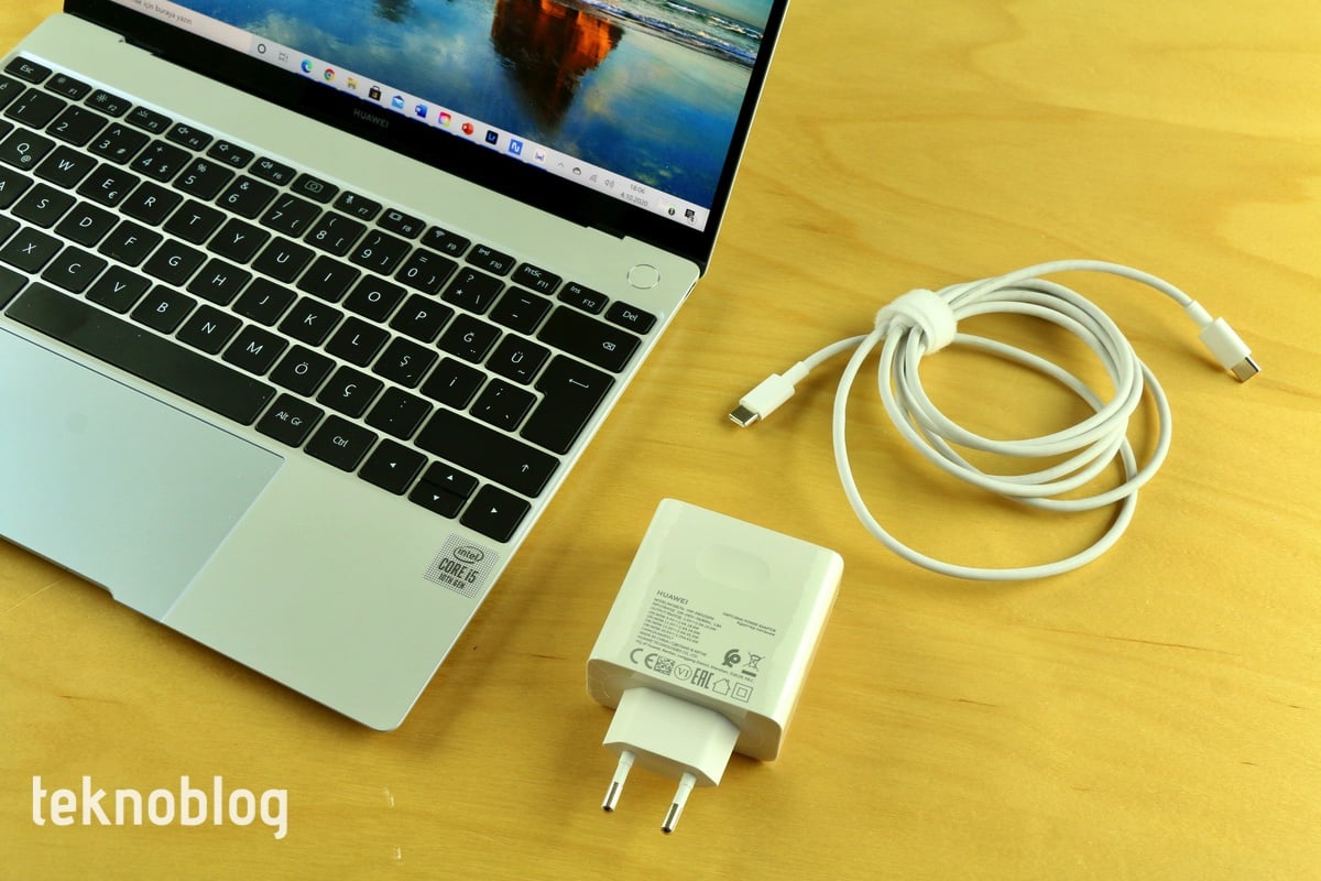 Diğer Huawei dizüstü bilgisayarları gibi MateBook X de 65W Huawei Hızlı Şarj teknolojili bir şarj adaptörüyle geliyor. 60 x 60 x 28mm’lik boyutları ve 160 gr. ağırlığıyla çantada fazla yer kaplamayacak ve ağırlık yapmayacaktır. Bu şarj adaptörü MateBook X’i gerçekten hızlı şekilde şarj ediyor. Huawei, sadece 30 dakika şarj ile 4 saat video oynatma imkanının elde edilebileceğini belirtiyor. Bu da pilin neredeyse yarısına yakın bir kısmının doldurulmasına karşılık gelir. Gerçekleştirdiğimiz pil şarj testinde, bilgisayar kapalı durumdayken pil seviyesi 40 dakikada yüzde 6’dan yüzde 57’ye çıktı. Tam doluluğa ulaşması ise bir buçuk saatin sonunda gerçekleşti.