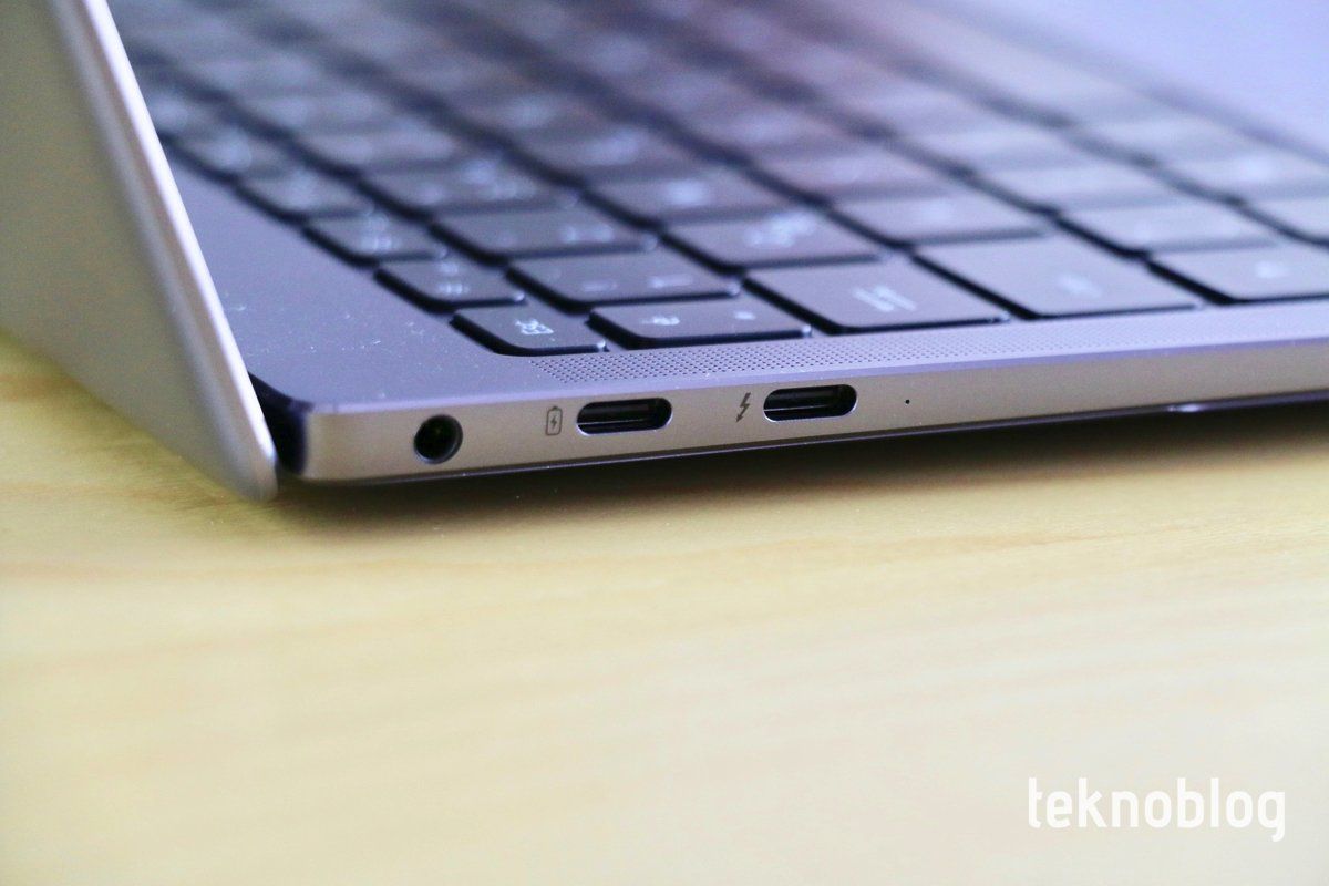 Bağlantı unsurları tarafına baktığımızda, Huawei’nin port işini abartmadığını, ancak ihtiyaç duyulabilecekleri sunduğunu görüyoruz. Sağ tarafta tek bir USB-A portu var. Bu sayede birçok cihazınızı rahatlıkla bağlayabilirsiniz. Sol tarafta ise iki adet USB-C portu var, bunlardan bir tanesi Thunderbolt 3 destekliyor. Diğerini de güç girişi veya diğer USB-C aygıtlarınız için kullanabilirsiniz. Kutudan çıkan güç adaptörü çok büyük değil, böylelikle çantada rahatlıkla taşıyabilirsiniz. Öte yandan Huawei MateBook X Pro’nun kutusuna HDMI ve VGA çıkışlarının yer aldığı bir adaptörü de yerleştirmiş. Böylelikle dizüstü bilgisayarının görüntüsünü harici ekranlara yansıtmak isteyenleri zahmetten kurtarıyor. SD kart yuvası veya Ethernet portu yok. Bunların sunduğu imkanlardan yararlanmak için kendi aksesuarlarınızı kendiniz edinmelisiniz. Bu arada sol tarafta 3.5mm kulaklık jakı ve şarj durumunu gösteren küçük bir LED lamba da bulunuyor.