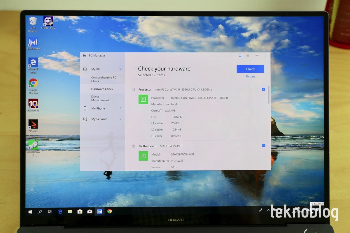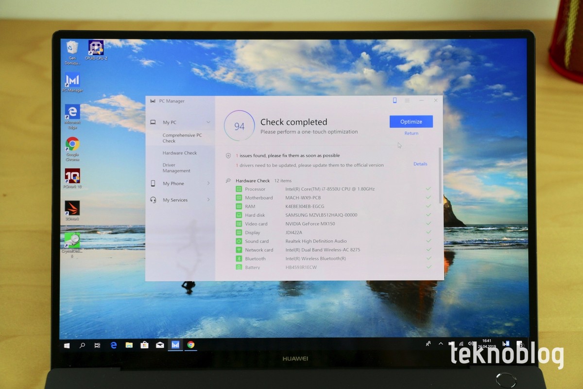 Huawei’nin Windows 10 üzerinde yüklü olarak sunduğu araçlardan bir tanesi yukarıda belirttiğimiz Display Manager ise, diğeri de PC Manager. PC Manager, dizüstü bilgisayarı Huawei akıllı telefonundan bildiğimiz Telefon Yöneticisi veya Optimizer adlı uygulamaya benzer biçimde çalışıyor. PC üzerinde tanı uygulayarak performansı daha da artırmaya yönelik tavsiyeleri karşınıza getiriyor. Bunun yanı sıra donanım kontrolü, sürücü yönetimi ve güncellemeleri de bu yazılım üzerinden gerçekleştirilebiliyor.