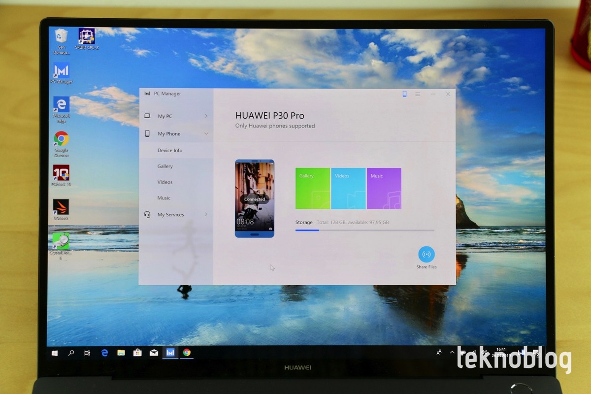 Eğer Huawei marka akıllı telefonunuz varsa, PC Manager ile MateBook X Pro’ya kolaylıkla bağlayabilirsiniz. Yazılım içindeki QR kodunu okuttuktan sonra saniyeler içinde bağlantı kuruluyor. Bundan sonra Galeri, Videolar ve Müzik dosyaları PC Manager üzerinden görüntülenip bilgisayara aktarılabiliyor. Öte yandan Huawei Share adı verilen hızlı ve pratik paylaşım yöntemini de MateBook X Pro ve Huawei akıllı telefonları arasında kullanabilirsiniz. Böylelikle çektiğiniz fotoğrafları veya videoları MateBook X Pro’ya seri biçimde aktarabilirsiniz.
