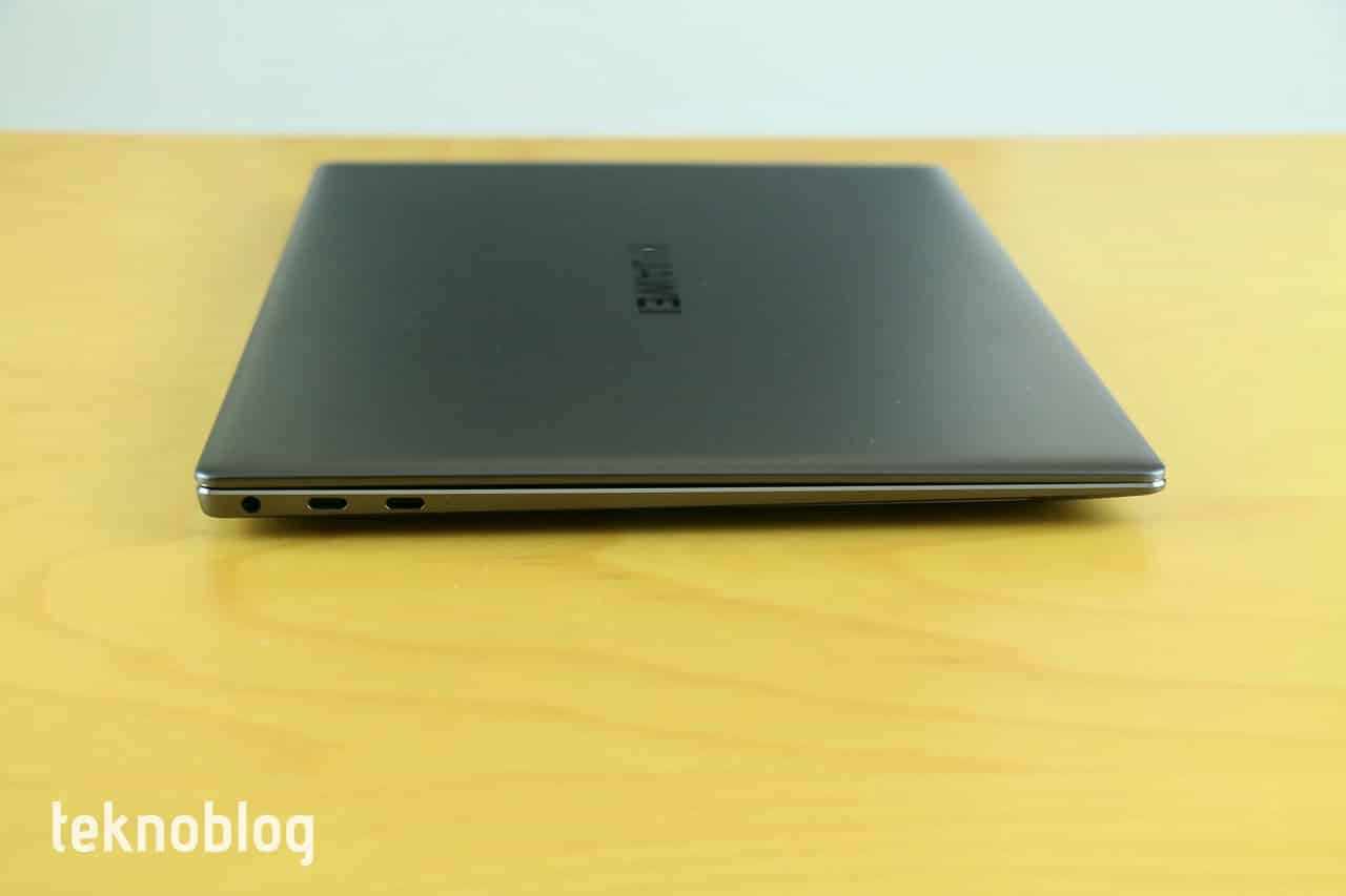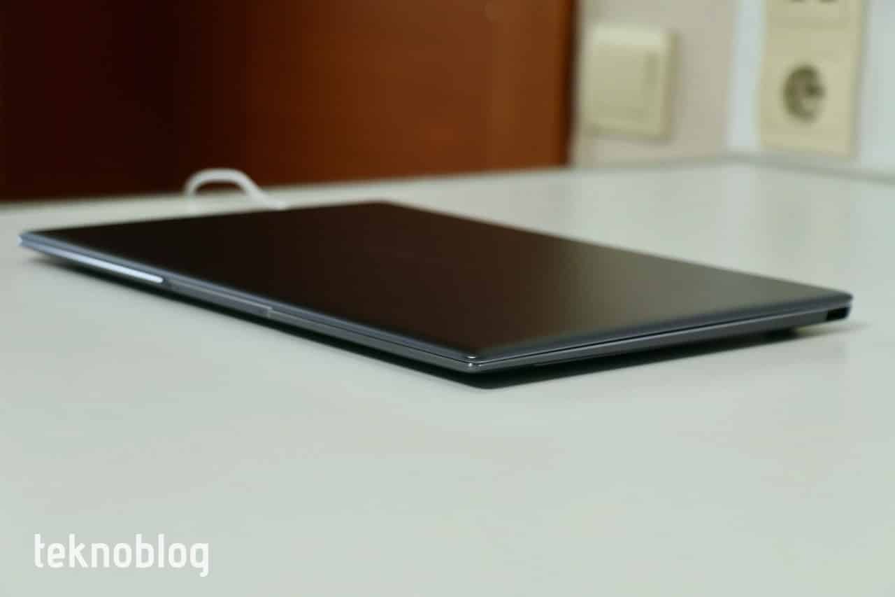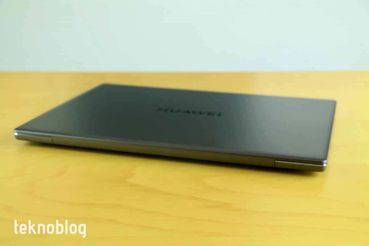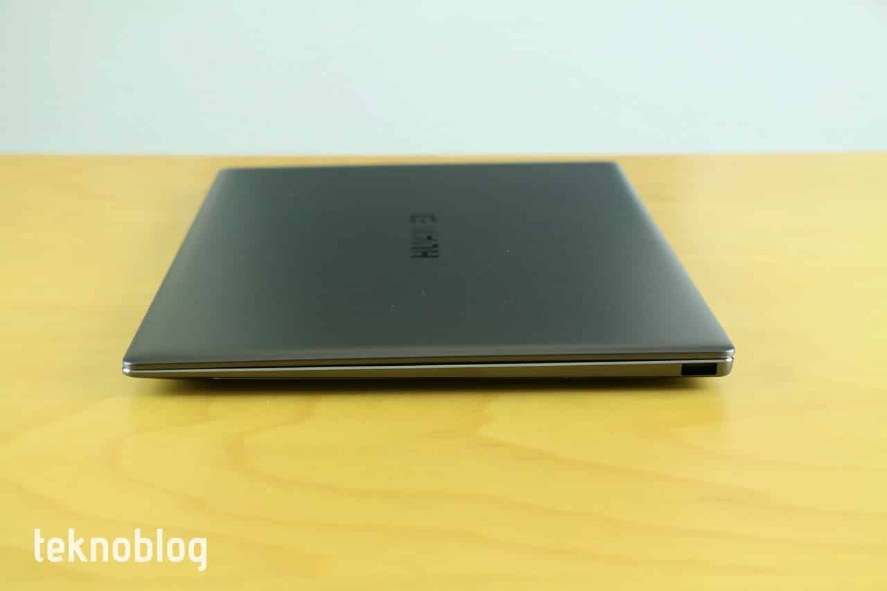 Dizüstü bilgisayarın mat ve hafif sürtünmeli bir yüzeyi var. Parmak izi ve kiri tutmada fena bir performans göstermediğini söyleyebiliriz. Özellikle trackpad’in her iki alanında bulunan ve yazı yazarken avuç içlerinin destek aldığı bölümler, hafif sürtünme sayesinde yazı yazarken daha rahat etmeyi sağlıyor. Kapak kısmında bulunan ve geçen yılın modelindekine göre daha da büyüyen Huawei logosu da epey şık duruyor. MateBook X Pro’nun taban kısmına baktığımızda, diğer üreticilerin aksine daha kapalı bir tasarımın tercih edildiğini görüyoruz. Dört köşeye yerleştirilmiş nokta biçimli tamponlar var. Ekran ve taban bölümünün birleştiği menteşe bölümünde ise bir kenardan diğerine doğru uzanan bir havalandırma ızgarası bulunuyor.