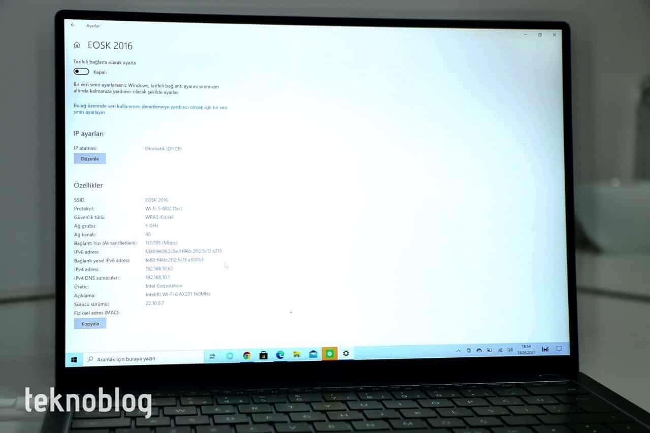 Fiziksel port seçeneklerinin dışında kablosuz bağlantı tarafına baktığımızda, Huawei’nin bu alanda da geçen yılın modeline göre dikkate değer bir ilerleme kaydettiğini görüyoruz. Geçen yılın modelinde Wi-Fi 6 desteğinin eksikliğinden bahsetmiştik. Huawei, 2021 model MateBook X Pro serisi ile bu açığı kapatıyor. Intel AX201 kablosuz yonga ile Wi-Fi 6 desteği de geliyor. Artık daha fazla göreceğimiz ve modem satın alırken aranan özelliklerden bir tanesi olacağını düşündüğümüz Wi-Fi 6 desteği bu dizüstü bilgisayarda mevcut. 802.11a/b/g/n/ac gibi desteklerin yanında sunulan 802.11ax Wi-Fi 6 desteği sayesinde destekleyen modemler veya kişisel erişim noktalarıyla gigabit mertebesinde veri aktarım hızlarına ulaşabilirsiniz. 2.4 GHz ve 5 GHz çift bant Wi-Fi desteğinin bulunduğunu da ekleyelim. Çift antenli yapı da iyi bir Wi-Fi performansının sunulmasını sağlıyor. Wi-Fi desteği tarafındaki önemli yeniliğin dışında Bluetooth 5.1 desteği de yer alıyor.
