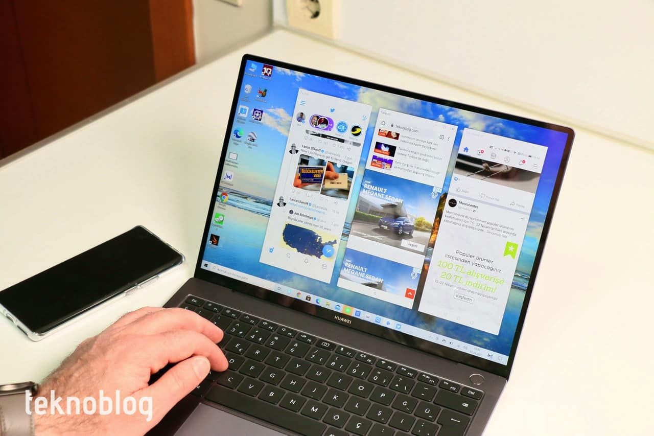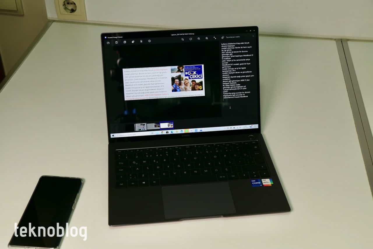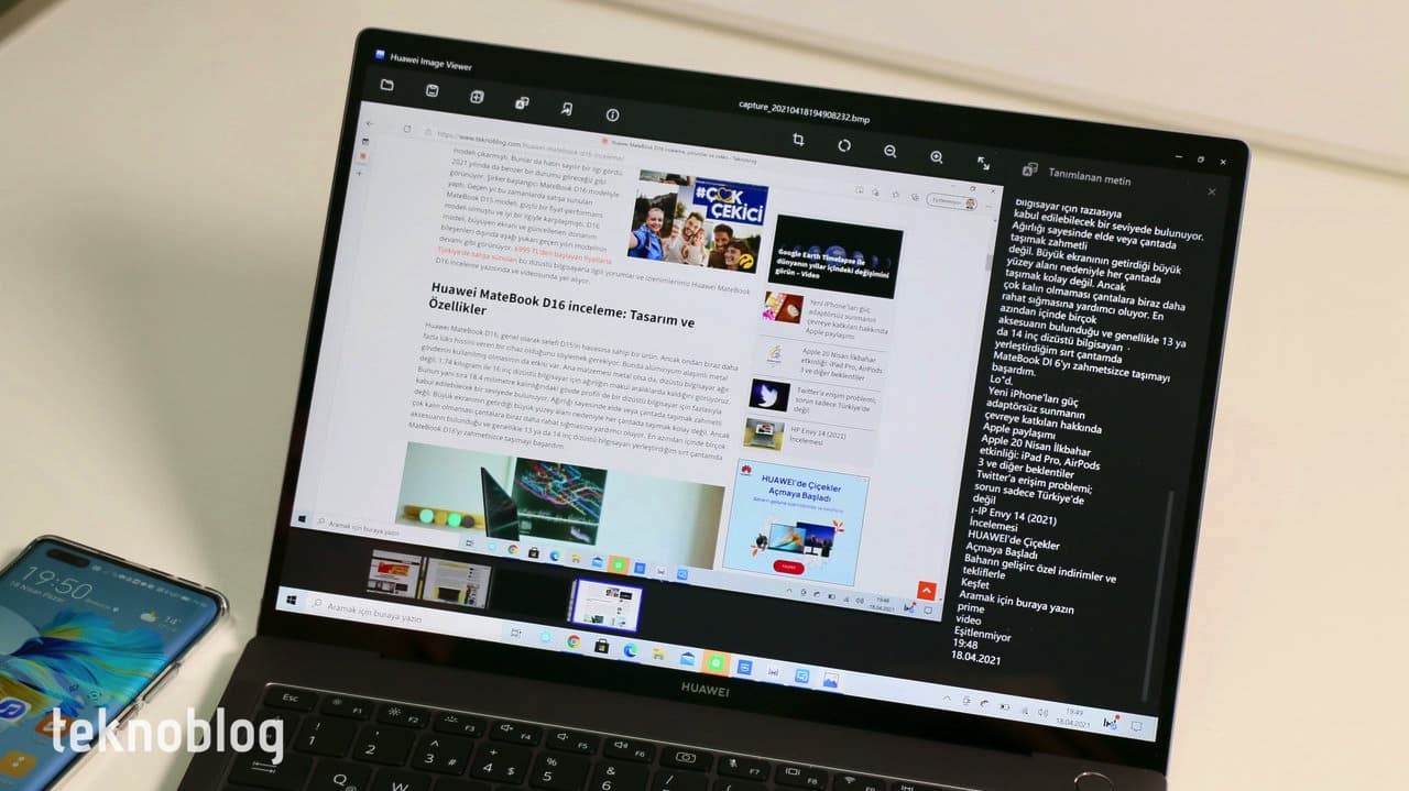 Ekran bölümünde belirttiğimiz gibi, ekran çoklu dokunma desteğine sahip. Bir dizüstü bilgisayarda dokunmatik ekran fazla kullanılmıyor, ancak Huawei eklediği bir özellikle sizin ekrana dokunma konusunda daha fazla istekli olmanızı sağlayacaktır. Üç parmağınızı aşağı kaydırarak hızlıca ekran görüntüsü alabilirsiniz. Bunun yanı sıra ekranda belli bir alanın ekran görüntüsünü alıp kaydetmek de oldukça kolay. Microsoft da son yıllarda Alıntı ve Taslak uygulamasıyla ekran görüntüsü alma işini kolaylaştırdı, ancak Huawei’nin sunduğu bu yerleşik ekran görüntüsü alma işlevi daha kullanışlı.