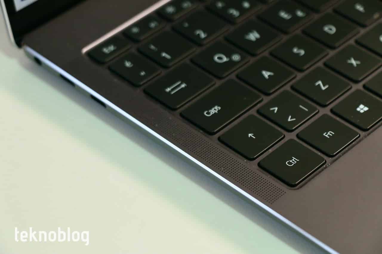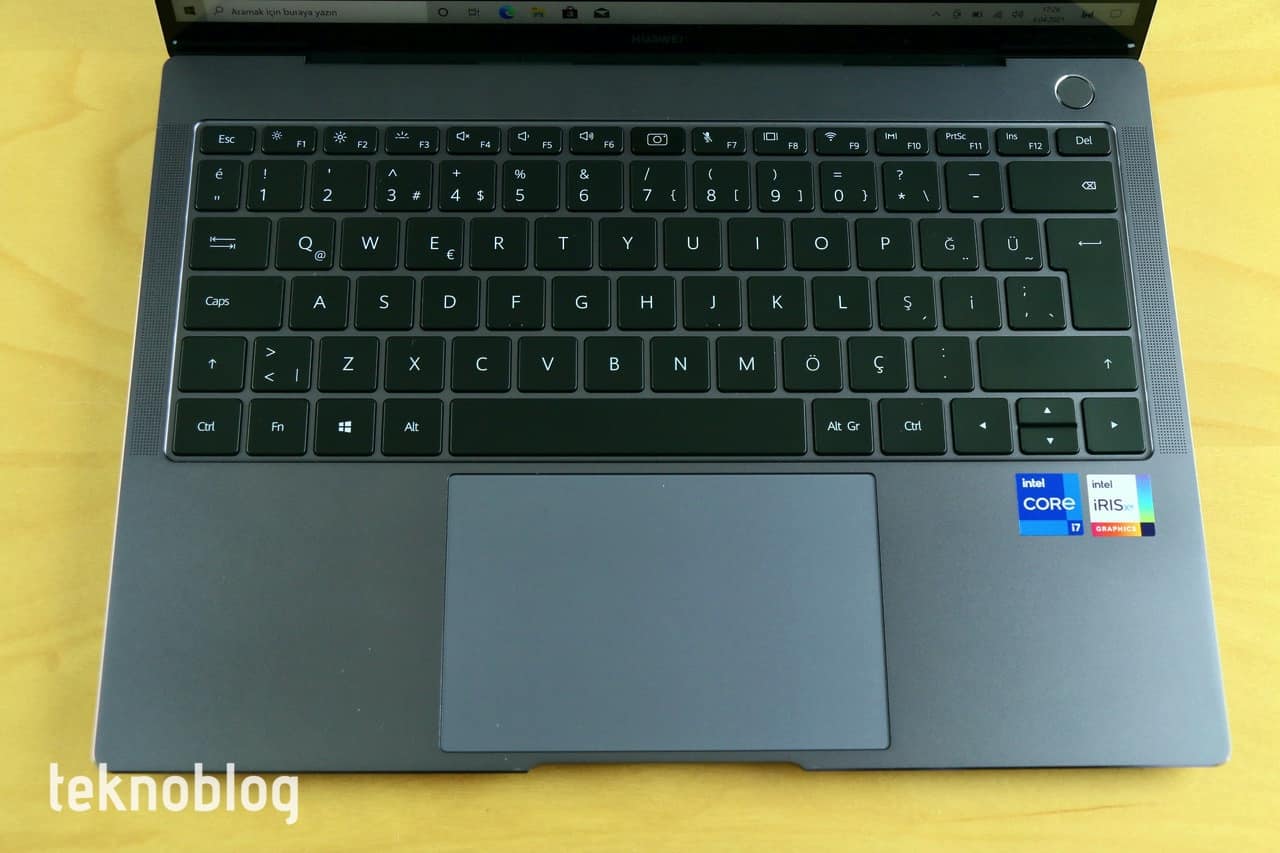 Klavyeye yerleştirilmiş web kamerasından bahsetmişken, yine buradan devam edelim. Klavye biçim ve büyüklük itibarıyla geçen yılın MateBook X Pro modelindekiyle aynı. Tuş aralıkları iyi biçimde ayarlanmış, öte yandan geri, boşluk, Enter gibi yazı yazılırken sık kullanılan tuşların büyüklükleri de iyi. Geçen yıldan farklı olarak klavye tuşları biraz daha kararlı duruyor. Yazı yazarken daha tok bir ses duyuluyor ve tuşların oynaklığı geçen yılın modeline göre daha az. Bununla birlikte yeterli bir tuş basma aralığı var ve bu sayede yazı yazarken parmak uçlarınızda basınç hissetmiyorsunuz. Klavyedeki bu küçük, ancak önemli değişiklik sayesinde MateBook X Pro, bir üst sınıf dizüstü bilgisayar olduğu izlenimini daha iyi biçimde veriyor. Bu arada okuduğunuz bu inceleme yazısı satırları da MateBook X Pro 2021 üzerinde yazılıyor. Çok hızlı ve rahat biçimde yazdığımızı belirtmeden geçmeyelim.