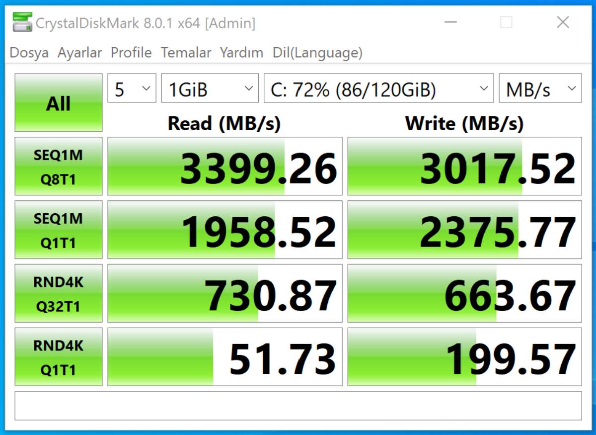 1 TB kapasiteli SSD de MateBook X Pro ile aynı fiyat seviyesindeki rakip dizüstü bilgisayarlarda gördüklerimizle benzer bir performans ortaya koyuyor. 3400 MB/s’ye kadar okuma ve 3000 MB/s’ye kadar yazma hızlarını gördük. Sonuç olarak MateBook X Pro 2021, Office programlarıyla çalışma gibi temel işlerin ötesinde, Photoshop, Premiere Pro veya benzeri üretkenlik işleri için de yeterli bir performansı sağlıyor.