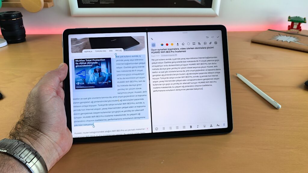 Elbette yazılım tarafı bu deneyimi daha da ileriye taşıyor. AppGallery’nin güvenli uygulama mağazası, GBox üzerinden Play Store erişimi ve MicroG desteğiyle Google uygulamalarını doğal şekilde kullanabilmeniz büyük bir avantaj. Bu açılardan alışılmış bir tablet deneyimini yansıtıyor. Aynı zamanda Huawei Notes ve GoPaint gibi uygulamalar, kalemle yazma ve çizim deneyimini üst seviyeye çıkarıyor. Çoklu görev özellikleri üretkenliği destekliyor, Çoklu Ekran İş Birliği ise cihazlar arasında kusursuz bir uyum sağlıyor. Bu özellikleri kullandığınızda yalnızca bir tablete değil, ekosistemin merkezine sahip olduğunuzu hissediyorsunuz. Yani cihaz, yazılım tarafında da güçlü bir bütünlük sunuyor.