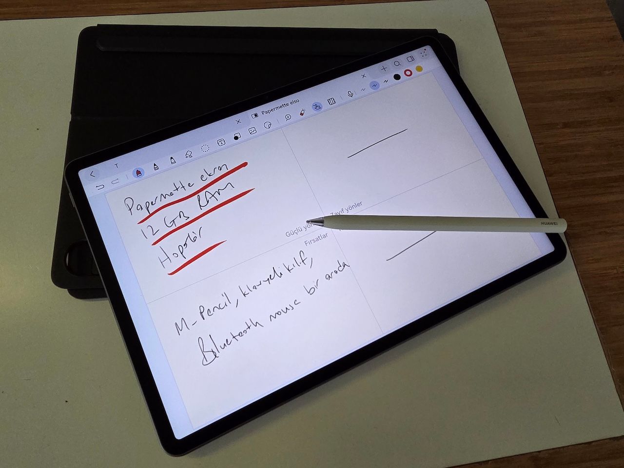 M-Pencil ise bu tabletin olmazsa olmazlarından biri olarak öne çıkıyor. Basınç ve eğim hassasiyeti oldukça gelişmiş olan bu kalem, özellikle dijital çizimle ya da detaylı not alma ile ilgilenen kullanıcıları hedef alıyor. Kalemin ucu ile ekran arasında belirgin bir gecikme olmaması, çizim sırasında kullanıcıya kağıt üzerindeymiş hissi veriyor. “Kağıt benzeri deneyim”, burada tam anlamıyla kendini gösteriyor. Ayrıca kalem, ekran üzerinde kaymıyor, kontrollü ve dengeli bir sürtünme hissi sunuyor. Kalemin tepesindeki yeni nesil fonksiyon tuşu sayesinde uygulama içi kısa yollar atanabiliyor, bu da çizim ya da not alırken hız kazandırıyor. Öte yandan kalemin titreşimle geri bildirim vermesi de fiziksel bir yazım hissi yaratıyor.