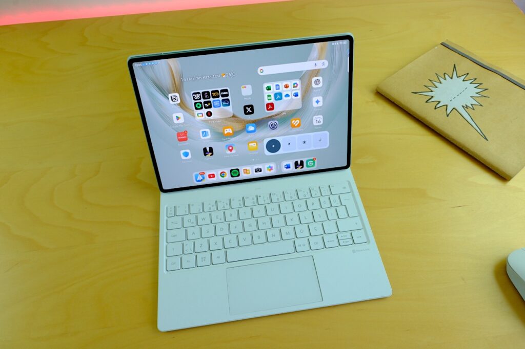 Yazılımla bütünleşik bir diğer önemli aksesuar ise Huawei Glide Klavye. Bu klavye sadece bir giriş aracı değil, onu aynı zamanda bir tablet standı, bir kalem saklama alanı ve bir şarj ünitesi olarak kullanabilirsiniz. Klavyeye entegre edilmiş M-Pencil yuvası sayesinde kalem hem korunuyor hem de otomatik olarak şarj ediliyor. Bu da kullanıcıların ekran kalemini kaybetme, şarj etmeyi unutma gibi klasik sorunları ortadan kaldırıyor. Glide Klavye’nin menteşe yapısı ise tek hamlede açılabilen, dizüstü bilgisayar benzeri bir deneyim sunuyor. Özellikle “Stüdyo Modu” adı verilen kullanım senaryosunda, tabletin alt kenarı touchpad üzerinde sabit kalıyor ve bu yapı, çizim yaparken ya da dokunmatik kullanım sırasında istenmeyen temasları ciddi oranda azaltıyor.