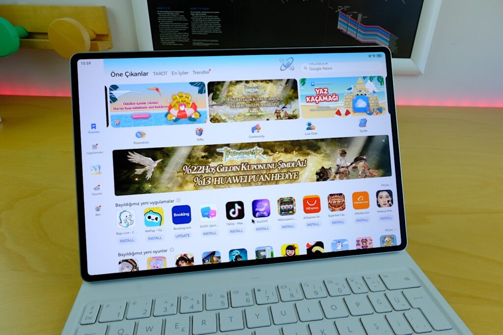 Yazılım tarafındaki bir diğer önemli unsur ise uygulama erişimi. Huawei AppGallery, tabletin ana uygulama mağazası olarak hizmet veriyor ve şu anda dünyanın en çok kullanılan üçüncü uygulama mağazası konumunda bulunuyor. AppGallery üzerinden, GBox isimli uygulama yüklenerek Google Play Store’a erişim imkanı da sağlanıyor. GBox, Google uygulamalarını destekleyen bir yapı sunduğu için kullanıcılar YouTube, Google Maps, Gmail ve benzeri uygulamaları doğrudan çalıştırabiliyor. Bununla birlikte uygulama içi Google ile oturum açma, arka plan servislerinin kullanımı gibi işlevler de MicroG aracılığıyla destekleniyor. Yani Google Play Store’un eksikliği bu modelde pratik yöntemlerle tamamen aşılmış durumda.