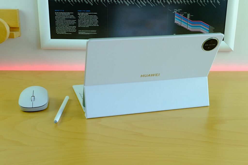 Tablet tasarımında dikkat çeken bir başka unsur ise kamera modülünün konumlandırılması ve yapısı. Huawei’nin daha önceki üst segment cihazlarında da karşımıza çıkan Space Ring tasarımı bu modelde de devam ettirilmiş. Ancak bu kez daha bütünleşik ve sade bir tasarım diliyle karşımıza çıkıyor. Kamera çıkıntısının minimize edilmesi, cihazın düz zemin üzerinde dengede kalmasını sağlarken, genel simetri algısını da olumlu yönde etkiliyor. Huawei’nin belirttiğine göre, metal halka çevresi ise 13 binden fazla mikro kesimle işlenmiş, bu da lüks saatlerde rastlanan bir yüzey dokusunu anımsatıyor.
