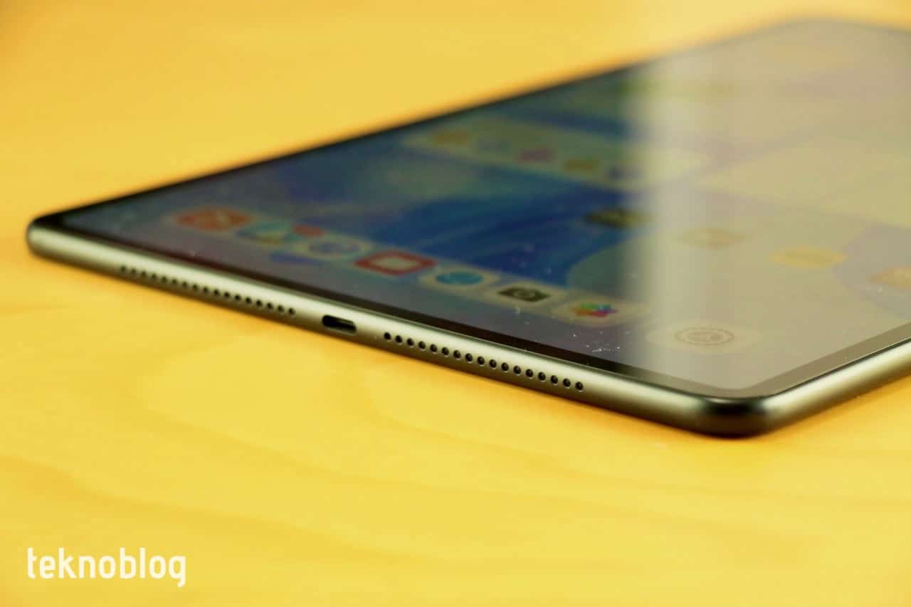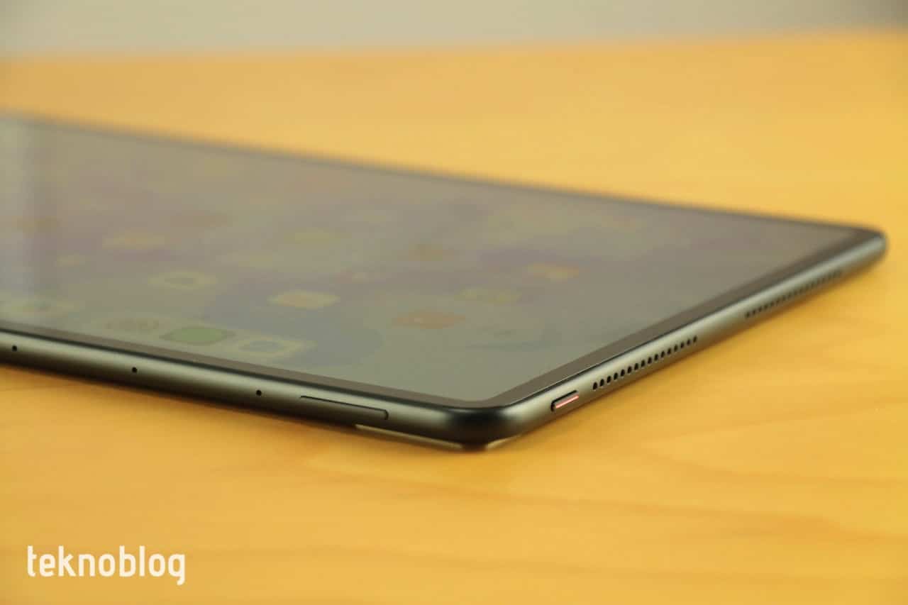 Huawei, bu tableti genel olarak yatay biçimde kullanımı düşünerek tasarlamış. Web kamerası ekranın uzun kenarının üstünde yer alıyor. Her iki kısa kenara yerleştirilmiş ikişer hoparlör mevcut. Web kamerasının yerleşimini dikkate alarak konuştuğumuzda, sağ kenarda USB-C portu iki hoparlörün ortasında bulunuyor. Sol kenarda ise güç düğmesi var. Üst kenarda ses tuşu, güç düğmesine yakın bir konumda, bu sayede kullanmak kolay. Tek bir parça ve derinliği iyi ayarlanmış. Üst kenarda üç mikrofonun bulunduğunu da belirtmeden geçmeyelim.