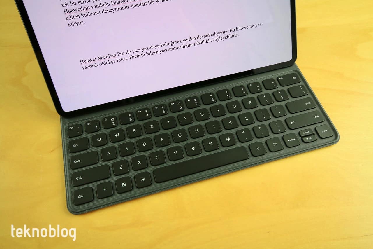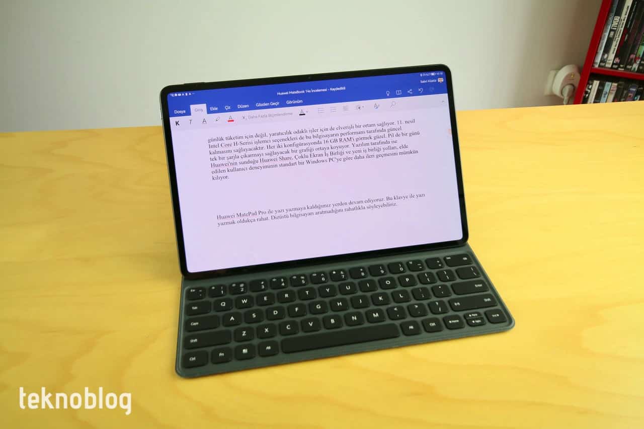 Klavyeli kılıf ise MatePad Pro’yu bir dizüstü bilgisayar rahatlığında kullanmaya izin veriyor. Geniş tuş aralıkları ve yeterli tuş basma aralığı sayesinde iyi bir yazı yazma deneyimi sunuyor. Tableti yerleştirecek iki farklı destek noktası mevcut. İçerik izlerken veya yazı yazarken bu iki farklı noktayı kullanabilirsiniz. Yazı yazarken ekranda sanal klavyenin otomatik düzeltme çubuğunu kapatamama sıkıntısı çekebilirsiniz. Varsayılan Swift Keyboard’da bu durumu gözlemledik. Celia Keyboard’da da aynı durum söz konusu. Bu nedenle Petal Search’ten Gboard Google klavyesini indirdik ve sorunu bu şekilde çözdük. Word, Excel ve bunun gibi uygulamalarda dokümanlarla sıklıkla çalışanlar için bu klavyeli kılıf epey kullanışlı olacaktır. Ayrıca önü ve arkayı kapatan tasarımı da tableti çantada rahatlıkla taşımaya izin verecektir.