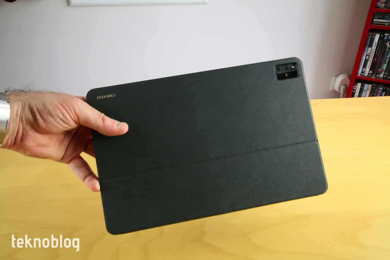 MatePad Pro 12.6’nın arka yüzü sade bir tasarıma sahip. Yumuşak ve hafif sürtünmeli yüzeyi tableti elde tutumayı biraz daha kolaylaştırıyor. Ortaya, yatay eksende küçük bir Huawei logosu yerleştirilmiş. Sağ üst köşede ise kamera modülü var. Burada üç kamera ve flaş var. Kamera modülü hafif de olsa dışarı doğru çıkıntı yapıyor. Bu durum tableti bir masaya koyup sanal klavyede yazı yazarken onun hafif de oynamasına neden oluyor.
