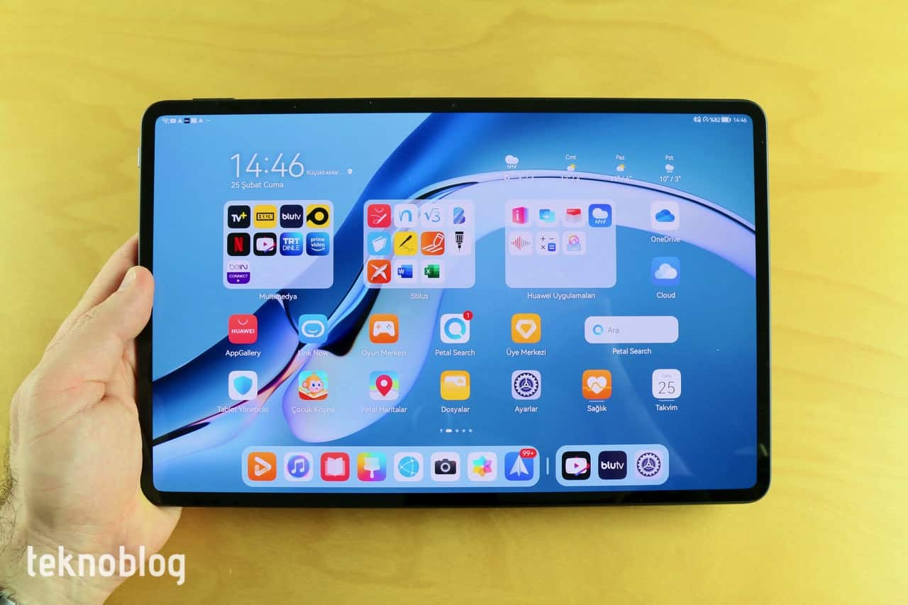 Huawei MatePad Pro 12.6’da HarmonyOS 2 yüklü olarak geliyor. Huawei’nin bu yeni işletim sistemini daha önce MatePad 11 sayesinde ilk kez bir tablette görme imkanını elde etmiştik. HarmonyOS ile birlikte yepyeni bir arayüz geliyor, daha önceki Huawei tabletlerinde gördüğümüz EMUI’dan farklı bir deneyim mevcut. Öncelikle yepyeni bir ana sayfa tasarımı var. Bu, kullanıcıların masaüstüne yakın bir deneyim elde etmeleri amacıyla tasarlandı. Uygulama ikonları ve widget’lar aynı ekranlarda düzenli biçimde duruyor. Ekranın alt kısmındaki istasyonda 11 uygulama tutulabiliyor. Burada sol tarafta sekiz uygulama sabit biçimde tutulurken, en son kullanılan uygulamalar da istasyonun sağ tarafında gösteriliyor. Sık kullandığınız uygulamaları istasyonun soluna sabitleyerek bunlara her an rahatlıkla erişebilirsiniz.