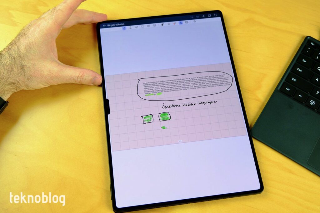 Huawei M-Pencil’ı MatePad Pro 13.2’nin kamera tarafındaki uzun kenarında yer alan manyetik alana tutturarak eşleştirebilirsiniz. Manyetik kuvvet yardımıyla buraya sıkıca tutunuyor, taşırken de rahatlık sağlıyor. Öte yandan şarj işlemi de buradan gerçekleşiyor. M-Pencil ile kullanabileceğiniz birçok uygulamayı Huawei AppGallery’de ve GBox aracılığıyla Google Play Store’da bulabilirsiniz. Ancak Huawei Notes uygulaması, tek başına fazlasıyla kullanışlı ve başka bir uygulama kullanmaya ihtiyaç bıraktırmıyor.