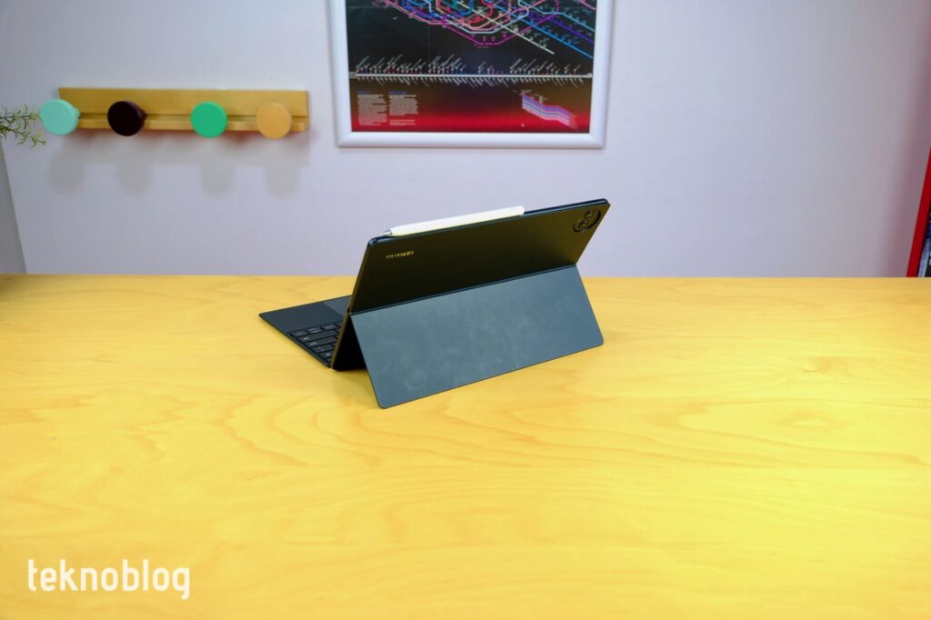 Öncelikle Akıllı Manyetik Klavye, MatePad Pro 13.2’yi tam donanımlı bir dizüstü bilgisayara dönüştürüyor. Bu aksesuar iki parçadan oluşuyor. Birinci parçayı manyetik kuvvet yardımıyla arkaya sıkıca tutturuyorsunuz. Bu parçada yer alan stand 45 dereceye kadar açılabiliyor, bu da tableti rahatlıkla bir yere koymanıza, görüntülü görüşmeler gerçekleştirmenize veya dizüstü bilgisayar gibi kullanacak şekilde konumlandırmanıza izin veriyor.