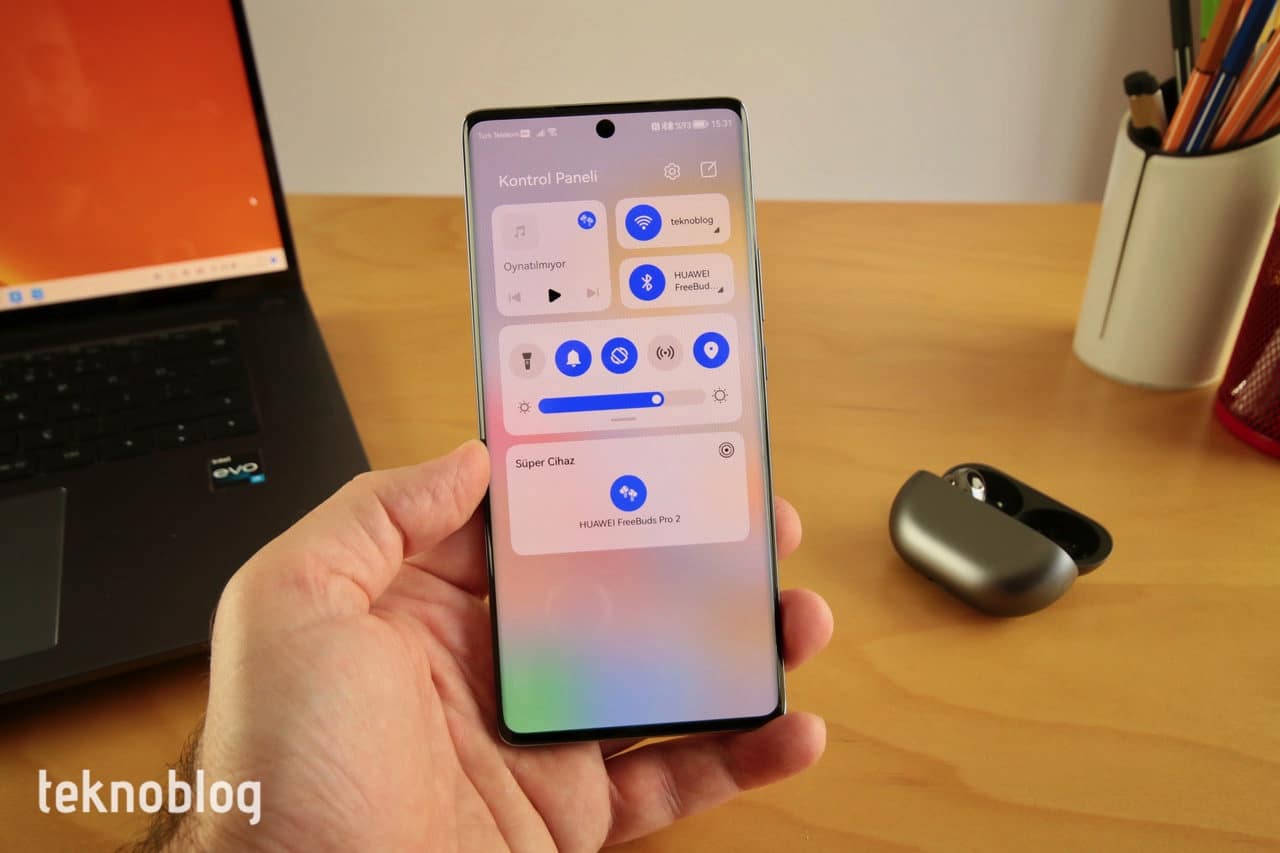 Nova 10’un sağ üst köşesinden aşağı doğru sürüklediğinizde erişebileceğiniz Kontrol Paneli ise, çalma kontrollerinin yanı sıra Wi-Fi, Bluetooth ve diğer telefon kontrollerine hızlı şekilde erişmenizi ve bunları yönetmenizi sağlıyor. Ekran parlaklığı ayarı da kolayca kullanılabilecek bir noktaya konumlandırılmış. Kontrol Paneli içinde bir de Süper Cihaz bölümü var. Eğer Nova 10 dışında bir Huawei cihazınız varsa ki, bu bir MateBook Serisi dizüstü bilgisayar, MatePad Serisi tablet, FreeBuds Serisi kablosuz kulaklık, Sound Serisi hoparlör veya EMUI yüklü bir Huawei telefonu olabilir, bunları aktif durumda ve yakındayken Süper Cihaz kutucuğunda görebilir ve kolayca bağlantı kurabilirsiniz.