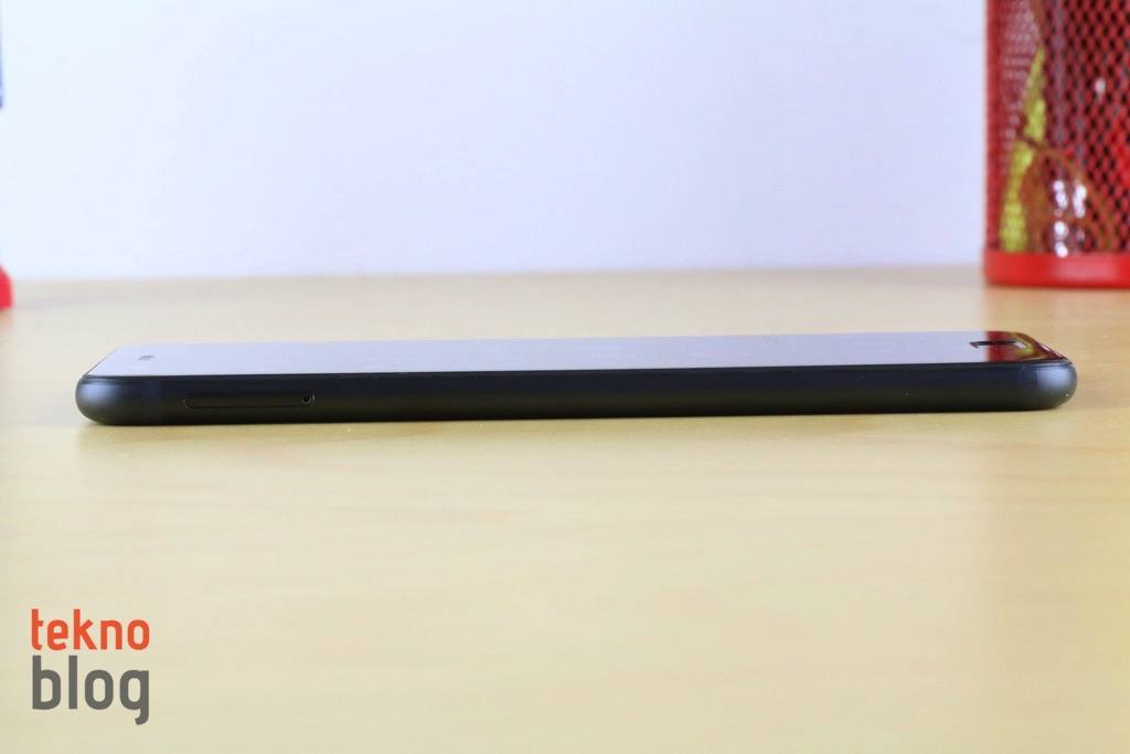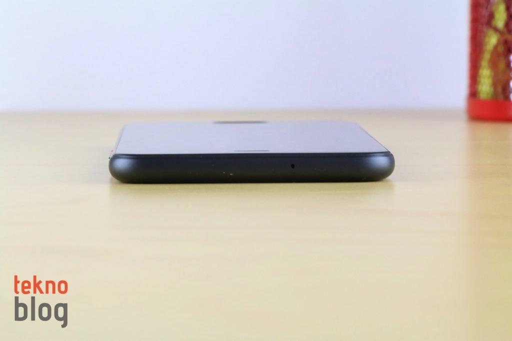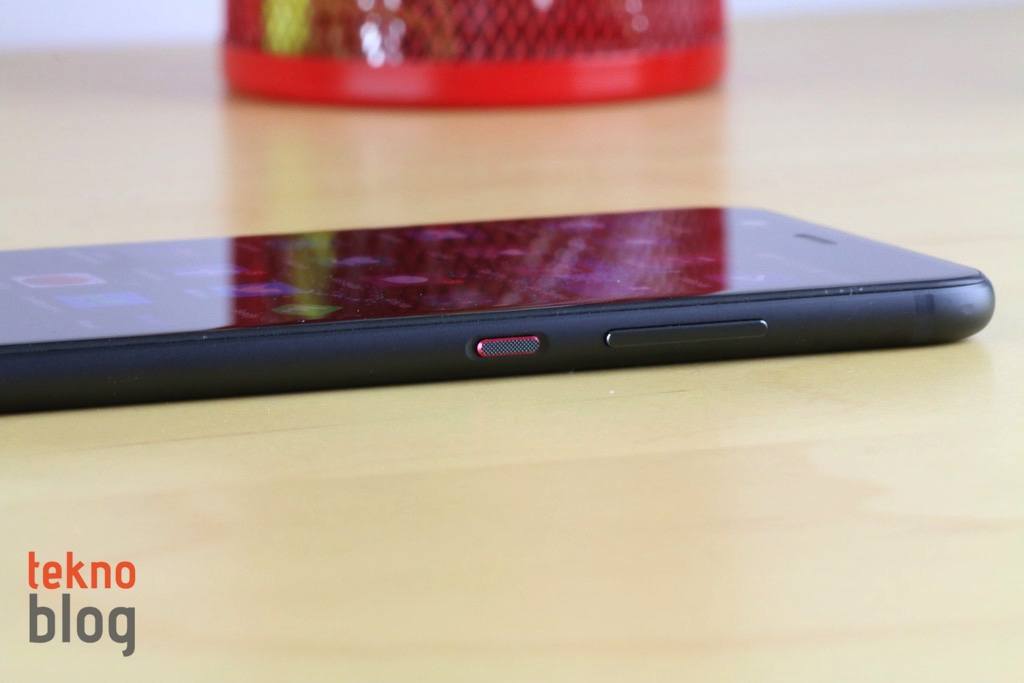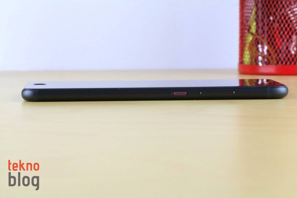Sağ kenardaki güç butonu dokulu yüzeyi ve kırmızı renkli çerçevesiyle telefona biraz farklı hava katıyor. Bunun üstünde de ses tuşunu görüyoruz. Telefonun alt kenarında mikrofon, hoparlör, USB-C portu ve 3.5 mm. kulaklık jakı bulunuyor. Üstte ise sadece ikinci mikrofonu görüyoruz. Arkada yer alan çift kamera sisteminin çıkıntı yapmaması da önemli bir detay sayılır.