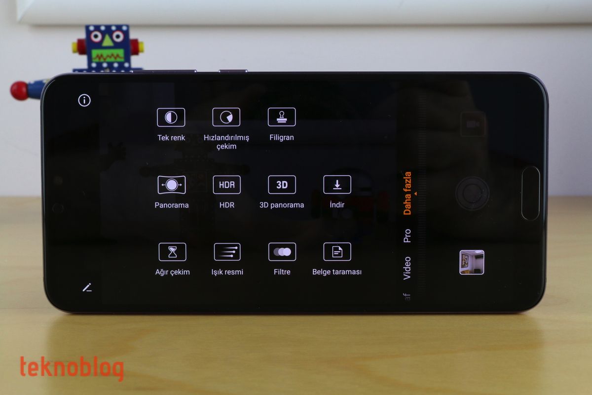 Kamera uygulaması iPhone ve Samsung Galaxy S9’un kamera uygulamalarından bazı izler taşıyor. Ekranın bir kenarında çekim tuşu, onun iki yanına yerleştirilmiş kamera değiştirme ve Galeri kısayolları bulunuyor. Bu grubunun hemen yanı başına da, çekim modları arasında hızlıca değişiklik yapmayı sağlayan bir kontrol yerleştirilmiş. Parmağınızı sürükleyerek Video, Portre, Fotoğraf, Pro, Gece gibi farklı çekim modları arasında geçiş yapabilirsiniz. Ekranın diğer kenarında ise flaş, hareketli fotoğraf, Ayarlar gibi kontroller bulunuyor. Ayrıca kare kod veya barkod taramayı sağlayan özel bir araca ait kısayol da bu sütuna yerleştirilmiş.